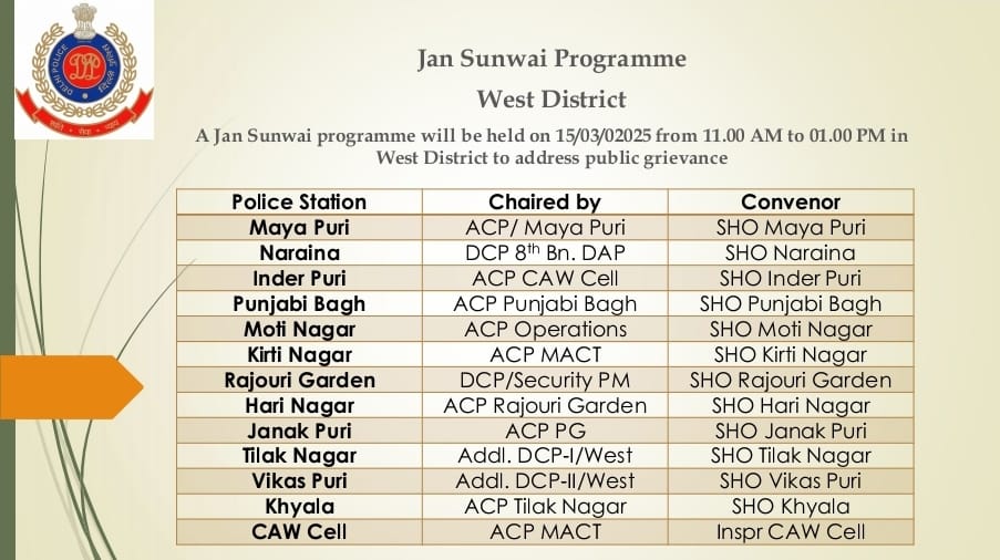 नई दिल्ली (15 मार्च 2025): दिल्ली पुलिस के पश्चिमी जिले में नागरिकों की समस्याओं को सुनने और समाधान प्रदान करने के लिए जन सुनवाई कार्यक्रम का आयोजन किया गया। यह कार्यक्रम 15 मार्च 2025 को सुबह 11 बजे से दोपहर 1 बजे तक आयोजित हुआ। इस विशेष पहल का उद्देश्य आम जनता की शिकायतों को प्राथमिकता के आधार पर हल करना था। हालांकि, इस समय के अलावा भी नागरिक अपनी शिकायतों को संबंधित थाने के अधिकारियों के समक्ष प्रस्तुत कर सकते हैं।
