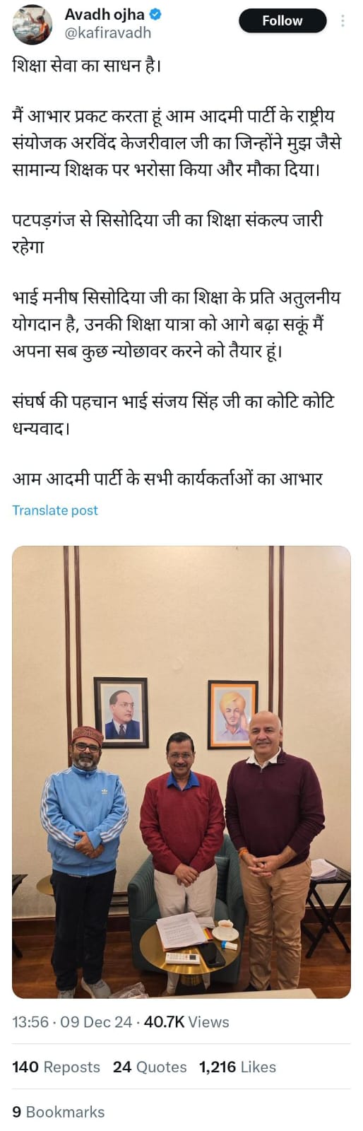 अवध ओझा ने पार्टी के सभी कार्यकर्ताओं को भी धन्यवाद दिया और भरोसा दिलाया कि वह पार्टी की शिक्षा नीति और जनता की भलाई के लिए समर्पित रहेंगे।