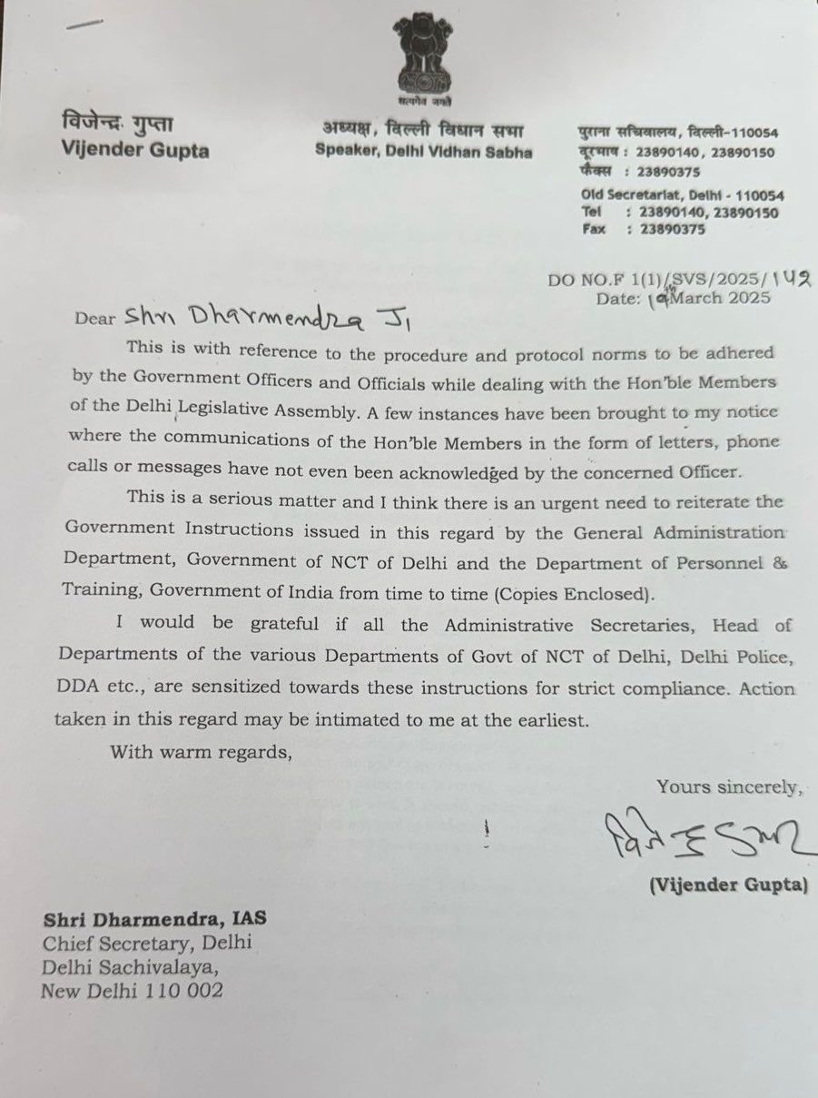 उन्होंने मुख्य सचिव से कहा कि दिल्ली सरकार के सभी प्रशासनिक सचिवों, विभाग प्रमुखों, दिल्ली पुलिस और डीडीए को स्पष्ट निर्देश दिए जाएं कि वे विधायकों के पत्रों और संदेशों का गंभीरता से जवाब दें। यह भी कहा कि इस संबंध में की गई कार्रवाई की जानकारी जल्द से जल्द विधानसभा को सौंपी जाए, ताकि यह सुनिश्चित हो सके कि भविष्य में इस तरह की समस्याएं उत्पन्न न हों।