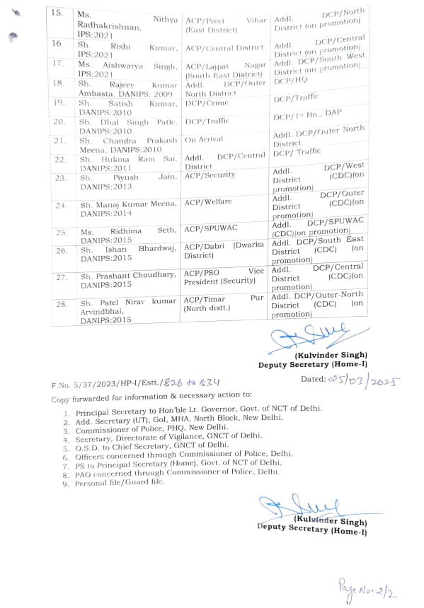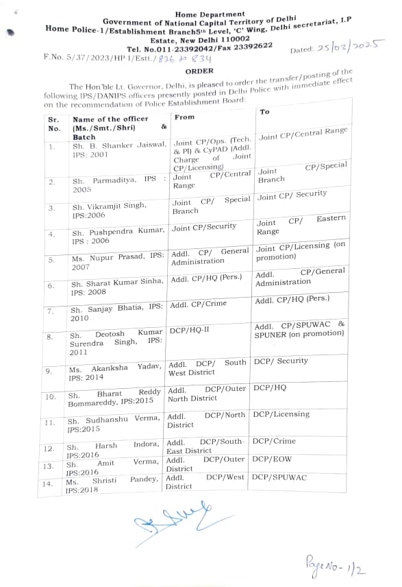 नई दिल्ली (25 मार्च 2025): दिल्ली पुलिस में एक बड़ा प्रशासनिक फेरबदल हुआ है, जिसमें 28 आईपीएस और दानिप्स अधिकारियों के तबादले किए गए हैं। दिल्ली के उपराज्यपाल वीके सक्सेना ने पुलिस स्थापना बोर्ड की सिफारिश पर इन अधिकारियों का ट्रांसफर किया। इस फेरबदल के पीछे पुलिस व्यवस्था को और अधिक प्रभावी और सुव्यवस्थित बनाने का उद्देश्य बताया जा रहा है।