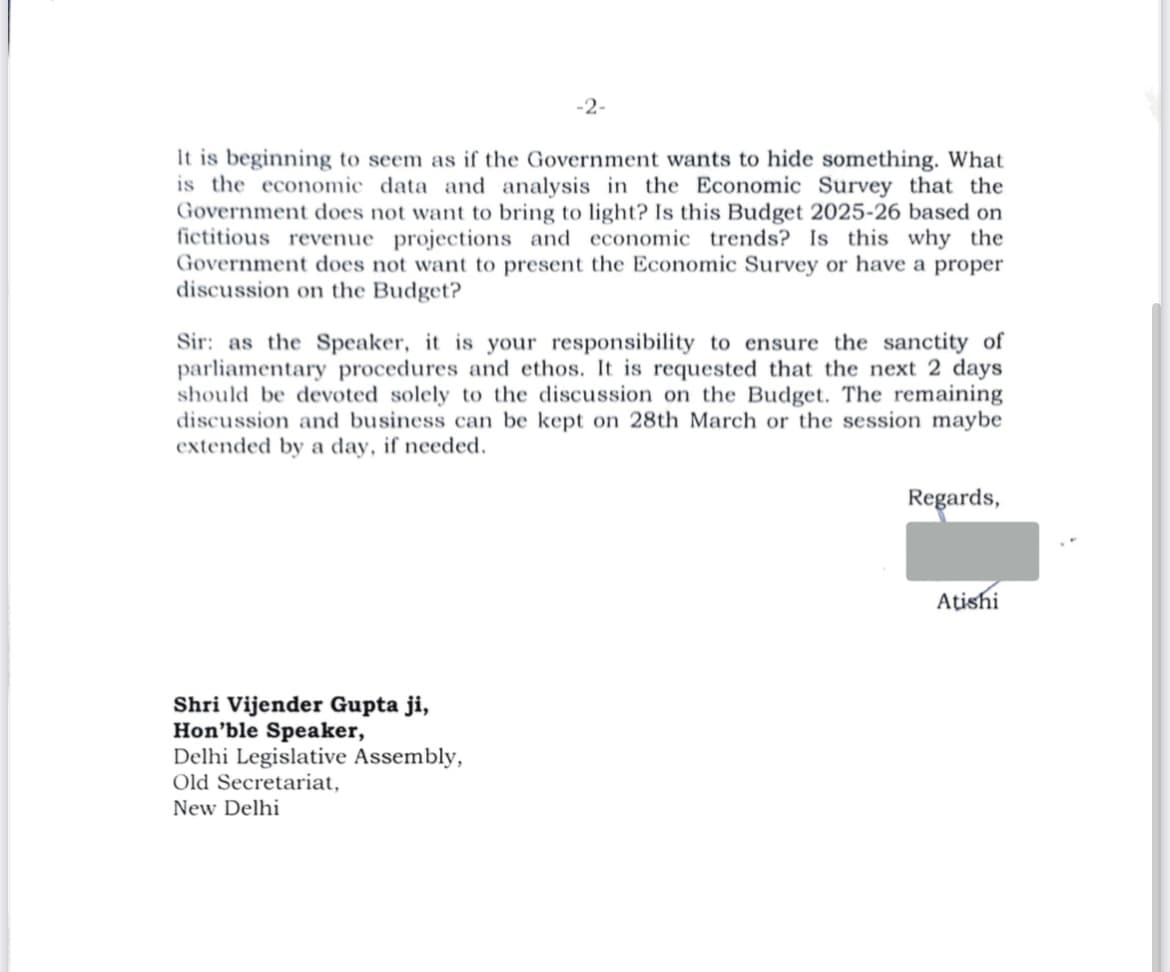 26 मार्च 2025 को लिखे गए इस पत्र में आतिशी ने कहा कि 2025-26 के बजट का दस्तावेज मुख्यमंत्री रेणुका गुप्ता द्वारा विधानसभा में पेश किया गया था, जो किसी भी विधानसभा सत्र के लिए सबसे महत्वपूर्ण दस्तावेज होता है। उन्होंने बताया कि इसके बाद बजट पर व्यापक चर्चा की जाती है, जहां दोनों पक्षों के विधायक अपने विचार प्रस्तुत करते हैं और वित्त मंत्री उन पर जवाब देते हैं। यह प्रक्रिया न केवल विधायकों के लिए, बल्कि दिल्ली के मतदाताओं और देशभर के लोगों के लिए भी महत्वपूर्ण होती है।