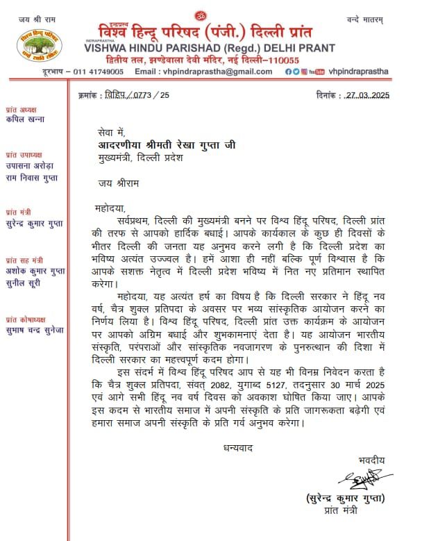 नई दिल्ली (29 मार्च, 2025): विश्व हिंदू परिषद (विहिप) दिल्ली प्रांत ने मुख्यमंत्री रेखा गुप्ता को पत्र लिखकर 30 मार्च को सार्वजनिक अवकाश घोषित करने की मांग की है। यह दिन चैत्रीय नवरात्रि के प्रथम दिन के रूप में मनाया जाता है, जिसे हिंदू समाज के लिए अत्यंत पवित्र माना जाता है।