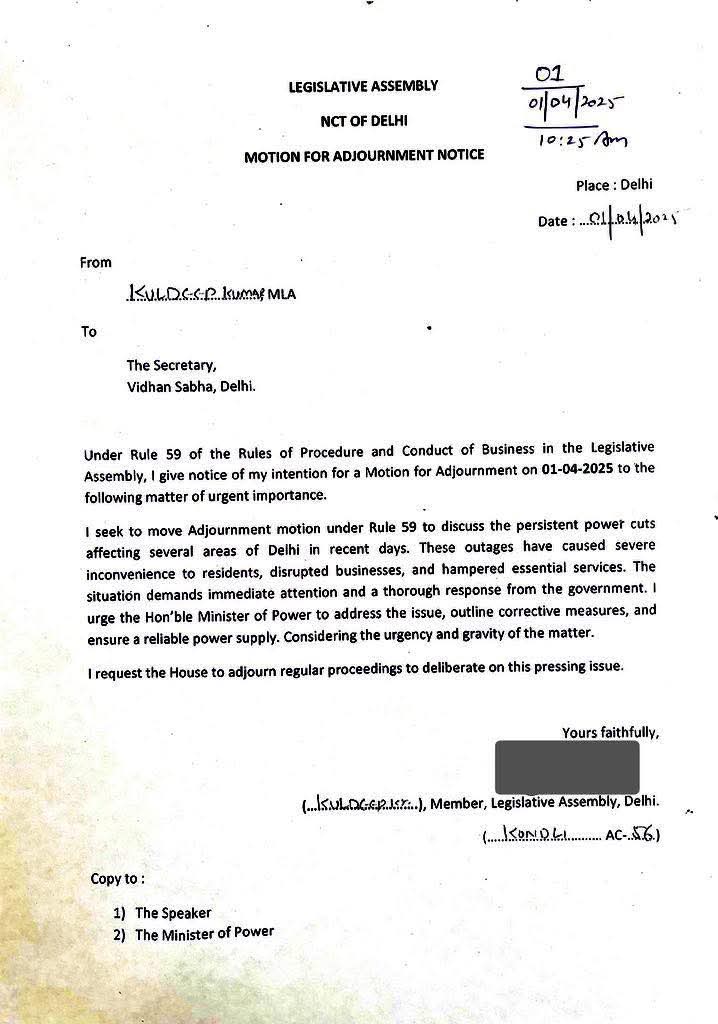 नई दिल्ली (1 अप्रैल 2025): दिल्ली में लगातार बढ़ रही बिजली कटौती को लेकर आम आदमी पार्टी (AAP) के विधायकों ने विधान सभा में मुद्दा उठाने की तैयारी कर ली है। AAP विधायकों संजीव झा और कुलदीप कुमार ने इस संबंध में विधानसभा में नोटिस दिया है। पार्टी का कहना है कि राजधानी में बार-बार बिजली गुल होने से आम लोगों को भारी परेशानी का सामना करना पड़ रहा है। खासकर गर्मी के मौसम में बिजली कटौती से जनता में नाराजगी बढ़ रही है। इस मुद्दे को लेकर AAP सरकार दिल्ली की बिजली आपूर्ति व्यवस्था की स्थिति पर चर्चा कर समाधान की मांग करेगी।