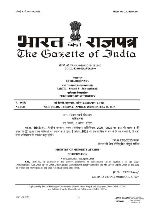 नई दिल्ली (08 अप्रैल 2025): अल्पसंख्यक कार्य मंत्रालय ने आज एक महत्वपूर्ण अधिसूचना जारी करते हुए वक्फ (संशोधन) अधिनियम 2025 को तत्काल प्रभाव से लागू कर दिया है। मंत्रालय ने यह अधिसूचना अधिनियम की धारा 1(2) के तहत जारी की है, जिसके अनुसार 8 अप्रैल 2025 की तारीख को अधिनियम के प्रावधानों के प्रभावी होने की तिथि घोषित किया गया है। इसके साथ ही अब यह अधिनियम पूरे देश में प्रभावी हो गया है।