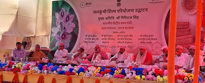 पटना, बिहार – 11 अप्रैल 2025: भारत सरकार के कपड़ा मंत्री गिरिराज सिंह ने आज लखनपुर बेगूसराय में जलकुंभी पर कौशल विकास कार्यक्रम का उद्घाटन किया। उद्घाटन समारोह में बिहार सरकार के खेल मंत्री सुरेन्द्र मेहता; बेगूसराय के विधायक कुंदन कुमार; मटिहानी के विधायक राज कुमार सिंह, भाजपा के वरिष्ठ नेता केशव सांडिल्य; जेडियू के जिला अध्यक्ष रूदल रॉय; भाजपा के जिला अध्यक्ष राजीव कुमार वर्मा; कपड़ा मंत्रालय में विकास आयुक्त (हस्तशिल्प) अमृत राज; जीविका बेगूसराय के डीपीएम अविनाश कुमार; ईपीसीएच के अतिरिक्त कार्यकारी निदेशक राजेश रावत सहित भारत सरकार के वरिष्ठ अधिकारी, उद्योग जगत के नेता, कारीगर और मीडिया प्रतिनिधि मौजूद रहे ।