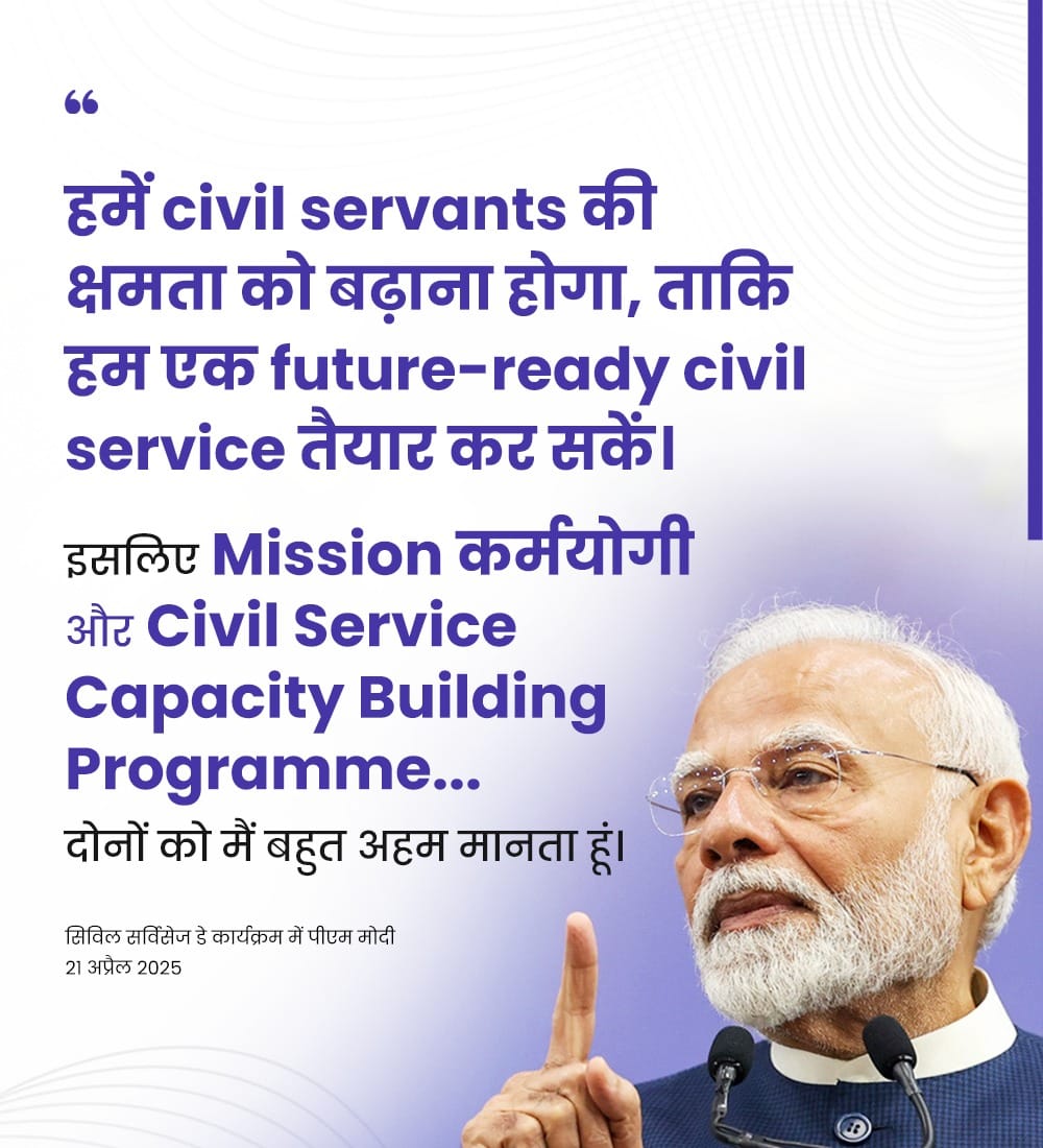 अपने संबोधन में प्रधानमंत्री मोदी ने यह भी स्पष्ट किया कि देश की उन्नति और सुशासन का मार्ग सशक्त एवं संवेदनशील सिविल सेवा से होकर गुजरता है। उन्होंने कहा कि मिशन कर्मयोगी जैसे कार्यक्रम सिर्फ प्रशिक्षण तक सीमित नहीं हैं, बल्कि यह मानसिकता, दृष्टिकोण और आचरण में बदलाव लाने की एक विस्तृत प्रक्रिया है। इसका उद्देश्य है कि अधिकारी सिर्फ नीति-निर्माता न रहें, बल्कि प्रभावी क्रियान्वयनकर्ता भी बनें। उन्होंने कहा कि वह इन दोनों पहलों को अत्यंत अहम मानते हैं क्योंकि यही भारत को वैश्विक स्तर पर प्रतिस्पर्धी और आत्मनिर्भर राष्ट्र बनाने में निर्णायक भूमिका निभाएंगे।।