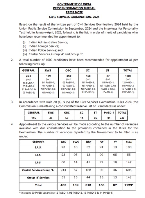 इस साल कुल 1056 रिक्त पदों पर नियुक्तियां की जानी हैं, जिनमें भारतीय प्रशासनिक सेवा (IAS), भारतीय विदेश सेवा (IFS), भारतीय पुलिस सेवा (IPS) सहित अन्य सेंट्रल ग्रुप ‘ए’7 और ग्रुप ‘बी’ सेवाएं शामिल हैं। चयनित अभ्यर्थियों को अब सेवाओं के अनुसार ट्रेनिंग के लिए बुलाया जाएगा, जो देश के प्रतिष्ठित संस्थानों में आयोजित की जाएगी। इस बार की भर्ती प्रक्रिया काफी व्यवस्थित और पारदर्शी रही, जिसमें लाखों उम्मीदवारों ने भाग लिया था और कई चरणों में चयन प्रक्रिया को पार किया।