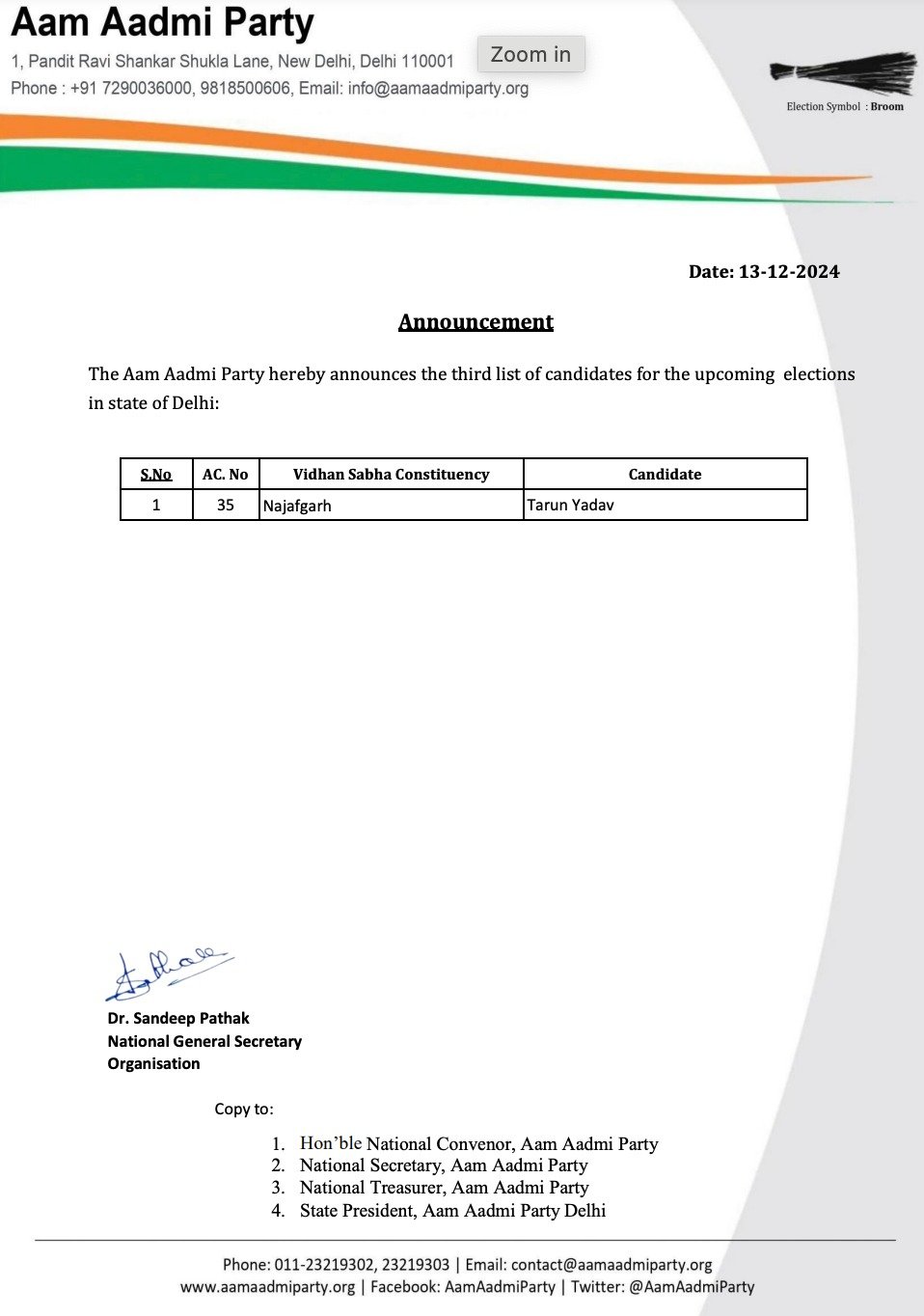 नई दिल्ली( 13 दिसंबर 2024): आम आदमी पार्टी (आप) ने दिल्ली विधानसभा चुनावों के लिए अपनी तीसरी सूची जारी कर दी है। लेकिन खास बात यह है कि इस सूची में केवल एक प्रत्याशी के नाम की घोषणा की गई है। पार्टी ने नजफगढ़ सीट से तरुण यादव को उम्मीदवार बनाया है।