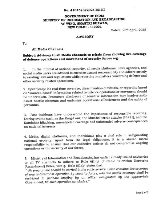 यह सलाह सूचना एवं प्रसारण मंत्रालय के डिप्टी डायरेक्टर छितिज अग्रवाल की स्वीकृति से जारी की गई है। इसमें कहा गया है कि कानूनों का उल्लंघन करने पर कानूनी कार्रवाई की जा सकती है। इस सलाह की प्रति स्व-नियामक संस्थाओं, इलेक्ट्रॉनिक मीडिया संघों और ब्रॉडकास्ट सेवा पोर्टल को भेजी गई है। मंत्रालय ने मीडिया संगठनों से परिपक्वता और विवेकशीलता दिखाने का आग्रह किया है। इस निर्देश का उद्देश्य मीडिया और सरकार के बीच बेहतर तालमेल सुनिश्चित करना है। सूचना एवं प्रसारण मंत्रालय ने पुनः दोहराया कि राष्ट्रीय सुरक्षा सर्वोपरि है। मीडिया का सहयोग इस दिशा में महत्वपूर्ण है।।