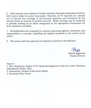 सूचना एवं प्रसारण मंत्रालय ने याद दिलाया कि पहले भी इसी तरह के दिशा-निर्देश जारी किए जा चुके हैं। केबल टेलीविजन नेटवर्क्स (संशोधन) नियम, 2021 के अंतर्गत ऐसे प्रसारणों पर प्रतिबंध का प्रावधान है। नियम 6(1)(p) के तहत यह निर्देश दिया गया था। इसके अनुसार, आतंकवाद विरोधी अभियानों और सुरक्षा बलों की गतिविधियों का लाइव टेलीकास्ट प्रतिबंधित है। केवल अधिकृत अधिकारी द्वारा अनुमति मिलने पर ही कवरेज किया जा सकता है। इस प्रावधान का उल्लंघन करने पर सख्त कार्रवाई की जा सकती है। मंत्रालय ने मीडिया को इस नियम का पालन सुनिश्चित करने की हिदायत दी है।