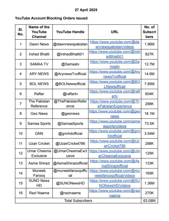 गृह मंत्रालय की सिफारिश पर भारत सरकार ने कई प्रमुख पाकिस्तानी यूट्यूब चैनलों पर प्रतिबंध लगा दिया है। इन चैनलों पर जम्मू-कश्मीर में हुई पहलगाम आतंकी घटना के मद्देनजर भारत, उसकी सेना और सुरक्षा एजेंसियों के खिलाफ भड़काऊ और भ्रामक सामग्री प्रसारित करने का आरोप है। प्रतिबंधित चैनलों में शामिल हैं: