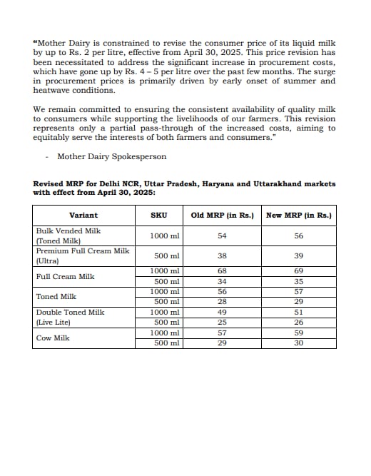 मदर डेयरी के प्रवक्ता ने बताया कि यह मूल्यवृद्धि अनिवार्य हो गई थी क्योंकि पिछले कुछ महीनों में दूध की खरीद लागत में 4 से 5 रुपये प्रति लीटर की बढ़ोतरी हुई है। गर्मी की जल्दी शुरुआत और लू जैसे मौसमीय बदलावों ने दूध उत्पादन पर असर डाला है। ऐसे मौसम में जानवरों की दूध देने की क्षमता घट जाती है, जिससे आपूर्ति में कमी आती है। उन्होंने कहा कि उपभोक्ताओं को गुणवत्ता वाला दूध लगातार उपलब्ध कराने के लिए यह कदम उठाना पड़ा। इसके साथ ही किसानों की आजीविका सुरक्षित रखना भी जरूरी है। यह बढ़ोतरी सीधे तौर पर डेयरी सेक्टर की स्थिरता से जुड़ी है। कंपनी ने भरोसा दिलाया कि यह फैसला सोच-समझकर लिया गया है।