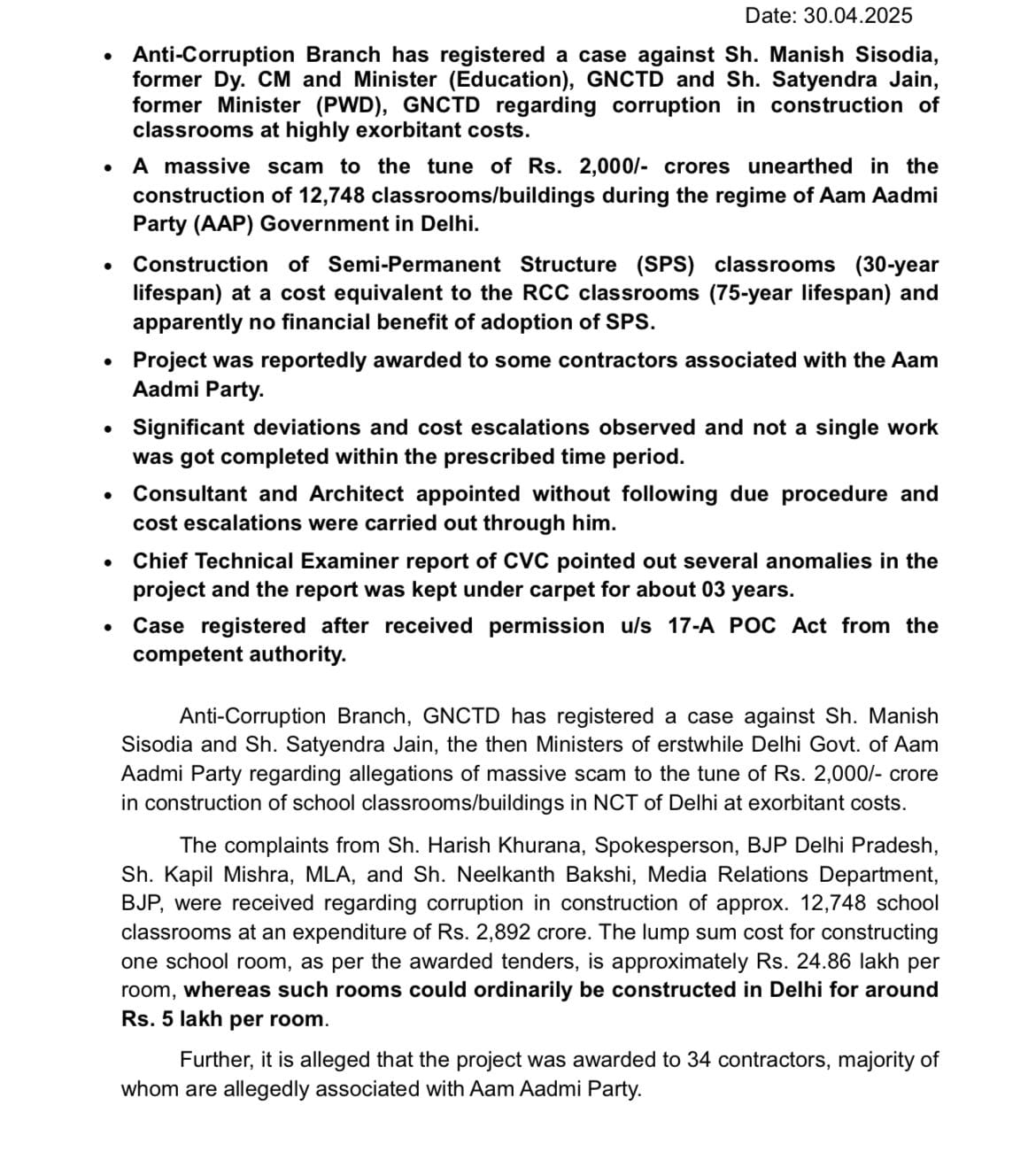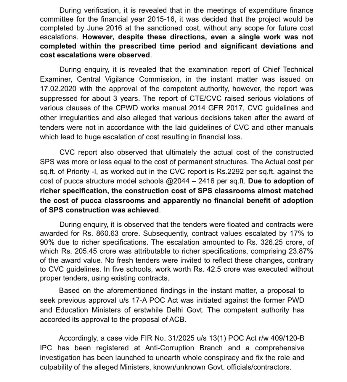 ACB की रिपोर्ट के अनुसार, आम आदमी पार्टी सरकार के दौरान दिल्ली में 12,748 स्कूल कक्षों के निर्माण में भारी अनियमितताएं सामने आईं। जिन कमरों को सामान्यतः 5 लाख रुपये में बनाया जा सकता था, वे करीब 24.86 लाख रुपये प्रति कक्ष की दर से बनाए गए। परियोजना की लागत कुल 2,892 करोड़ रुपये तक पहुंच गई, जिसमें से 860.63 करोड़ रुपये के टेंडर पास किए गए और फिर लागत में 17% से ज्यादा का इजाफा कर 326.25 करोड़ रुपये अतिरिक्त खर्च दिखाया गया।