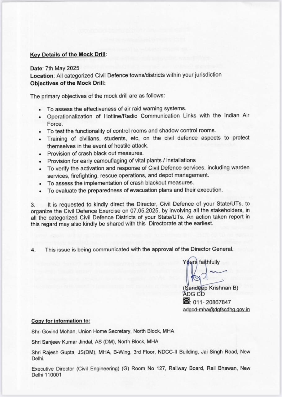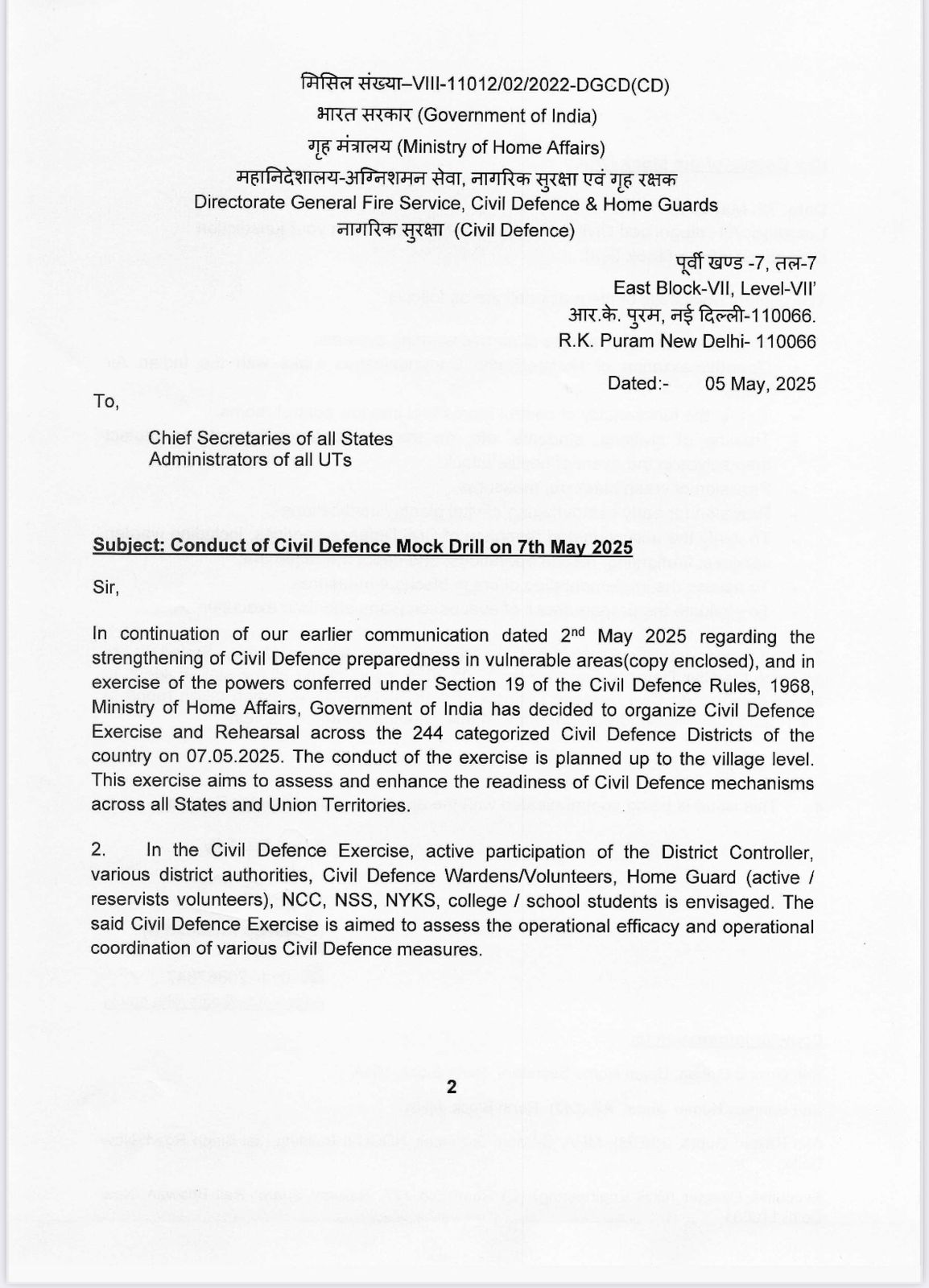 नई दिल्ली (06 मई 2025): भारत और पाकिस्तान के बीच सीमा पर बढ़ते तनाव को देखते हुए केंद्र सरकार ने सतर्कता के नए मानक तय किए हैं। केंद्रीय गृह मंत्रालय ने पूरे देश में सुरक्षा तैयारियों को परखने और नागरिकों को आपात स्थिति के लिए तैयार करने के उद्देश्य से 7 मई को “एयर रेड मॉक ड्रिल” आयोजित करने के निर्देश जारी किए हैं। यह मॉक ड्रिल विशेष रूप से नागरिक सुरक्षा के तहत लोगों को हवाई हमलों की आशंका के बीच जरूरी सतर्कता और बचाव उपायों की जानकारी देने के लिए आयोजित की जा रही है। गृह मंत्रालय ने यह स्पष्ट किया है कि यह अभ्यास पूरे देश के सभी राज्यों और केंद्र शासित प्रदेशों में एक साथ किया जाएगा, ताकि किसी भी संभावित खतरे की स्थिति में त्वरित और संगठित प्रतिक्रिया सुनिश्चित की जा सके।