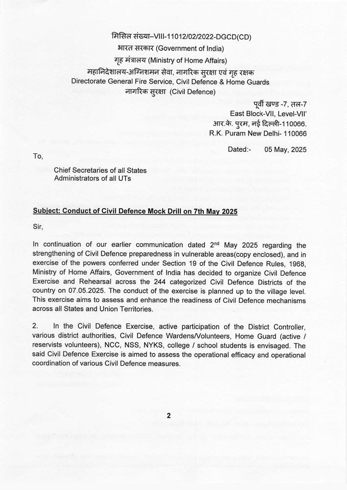 नई दिल्ली (06 मई 2025): देश की आंतरिक सुरक्षा को लेकर बढ़ती चिंता के बीच भारत सरकार के गृह मंत्रालय ने 7 मई 2025 को एक राष्ट्रव्यापी नागरिक सुरक्षा मॉक ड्रिल का आयोजन करने का निर्णय लिया है। गृह मंत्रालय के अधीन नागरिक सुरक्षा महानिदेशालय द्वारा सभी राज्यों और केंद्र शासित प्रदेशों के मुख्य सचिवों को पत्र भेजा गया है। पत्र में निर्देश दिया गया है कि यह मॉक ड्रिल देश के 244 श्रेणीबद्ध नागरिक सुरक्षा जिलों में आयोजित की जाएगी। खास बात यह है कि यह अभ्यास केवल शहरी क्षेत्रों तक सीमित नहीं रहेगा, बल्कि इसे गांव स्तर तक पहुंचाया जाएगा। इसका उद्देश्य नागरिकों को युद्ध या आपदा जैसी स्थितियों में आत्मरक्षा और सामूहिक सुरक्षा के लिए तैयार करना है।