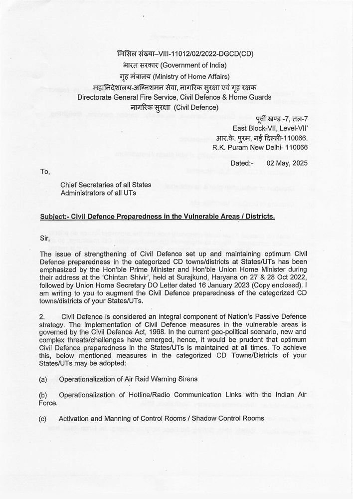 भारत सरकार ने 295 ऐसे जिलों की पहचान की है जो आंतरिक सुरक्षा की दृष्टि से संवेदनशील हैं। इन जिलों में नागरिक सुरक्षा उपायों को समय रहते लागू करने के लिए राज्य सरकारों को बार-बार पत्र भेजे गए हैं। ड्रिल से पहले 2 मई को भी एक पत्र जारी कर राज्यों को सख्त निर्देश दिया गया था कि वे अपने नागरिक सुरक्षा तंत्र की समीक्षा करें और बंकरों, खाइयों की सफाई, ब्लैकआउट सिस्टम की जांच जैसे कार्यों को प्राथमिकता दें। पत्र में यह भी कहा गया कि किसी भी आपातकालीन स्थिति में जनता की जान-माल की रक्षा सुनिश्चित करना सरकार की प्राथमिकता है।
