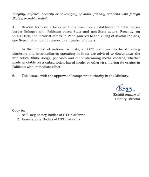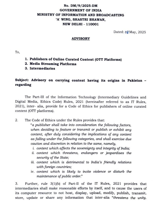नई दिल्ली (08 मई 2025): भारत सरकार ने एक महत्वपूर्ण कदम उठाते हुए देश में संचालित सभी ओटीटी प्लेटफॉर्म और मीडिया स्ट्रीमिंग सेवाओं को निर्देश दिया है कि वे पाकिस्तान मूल की किसी भी वेब-सीरीज, फिल्म, गाना, पॉडकास्ट या अन्य डिजिटल सामग्री का प्रसारण तत्काल प्रभाव से बंद करें। यह निर्देश उन सभी कंटेंट पर लागू होगा जो किसी भी सदस्यता आधारित या मुफ्त मॉडल के तहत भारतीय दर्शकों को उपलब्ध कराए जा रहे हैं। सरकार ने यह कदम राष्ट्रीय सुरक्षा, सांस्कृतिक अखंडता और सामाजिक समरसता को ध्यान में रखते हुए उठाया है।