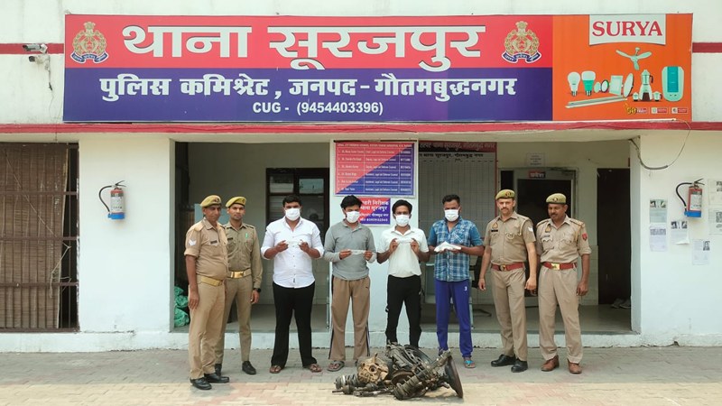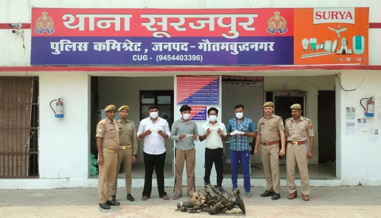ग्रेटर नोएडा (08 मई 2025): आज 08 मई को थाना सूरजुपर पुलिस ने लोकल इंटेलिजेंस व गोपनीय सूचना की सहायता से रैकी कर वाहन चोरी करने वाले 04 शातिर चोर मनीष, लक्की कसाना, मनीत उर्फ मन्नी और शोएब कुरेशी पुत्र शाहिद कुरेशी को थाना क्षेत्र से गिरफ्तार किया। आरोपी के कब्जे/निशादेही से वर्ष 2024 जुलाई माह में महामाया बस स्टैंड के पास से लूटी गई होंडा अमेज कार के पार्ट्स, चाकू और अवैध तमंचा-कारतूस बरामद किए आरोपियों ने कुछ पार्ट्स बेचकर प्राप्त पैसो को आपस में बांट लिया थे।