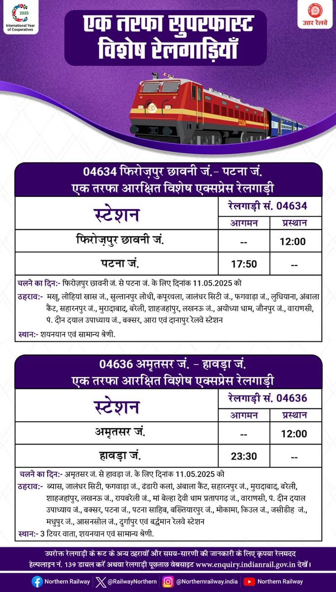 रविवार को उत्तर रेलवे द्वारा घोषित दो विशेष ट्रेनों में एक फिरोजपुर कैंट से पटना के लिए चलाई जा रही है। ट्रेन संख्या 04634 फिरोजपुर कैंट से 11 मई 2025 को दोपहर 12:00 बजे रवाना होगी और अगले दिन शाम 5:50 बजे पटना जंक्शन पहुंचेगी। यह ट्रेन मार्ग में मोगा, लुधियाना, सहारनपुर, लखनऊ, वाराणसी, बक्सर सहित कुल 24 प्रमुख स्टेशनों पर रुकेगी, जिससे अन्य क्षेत्रों में भी यात्रियों को राहत मिल सकेगी। इस ट्रेन में स्लीपर और जनरल कोच की सुविधा दी गई है, ताकि अधिक से अधिक लोग इसका लाभ उठा सकें।