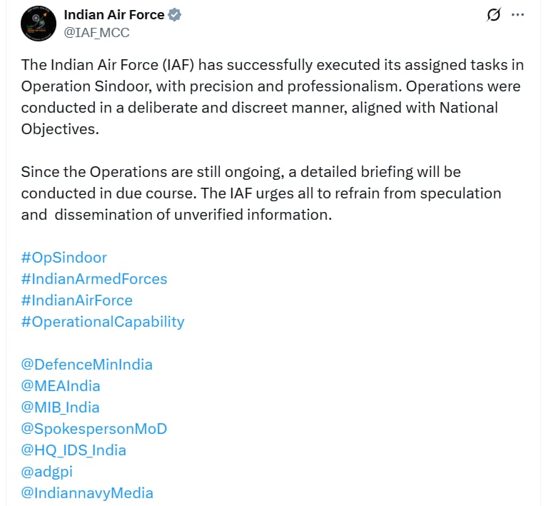 हालांकि “ऑपरेशन सिंदूर” के बारे में आगे की विस्तृत जानकारी अभी सार्वजनिक नहीं की गई है, लेकिन वायुसेना के इस संक्षिप्त बयान ने यह संकेत ज़रूर दिया है कि यह एक रणनीतिक अभियान है जो देश की सुरक्षा और हितों से गहराई से जुड़ा हुआ है। अब सभी की निगाहें उस विस्तृत ब्रीफिंग पर टिकी हैं, जिसमें इस महत्वपूर्ण अभियान की पृष्ठभूमि, उद्देश्य और उपलब्धियों के बारे में पूरी जानकारी दी जाएगी। तब तक के लिए, सभी से अपेक्षा की जा रही है कि वे संयम बरतें और केवल आधिकारिक स्रोतों पर ही भरोसा करें।