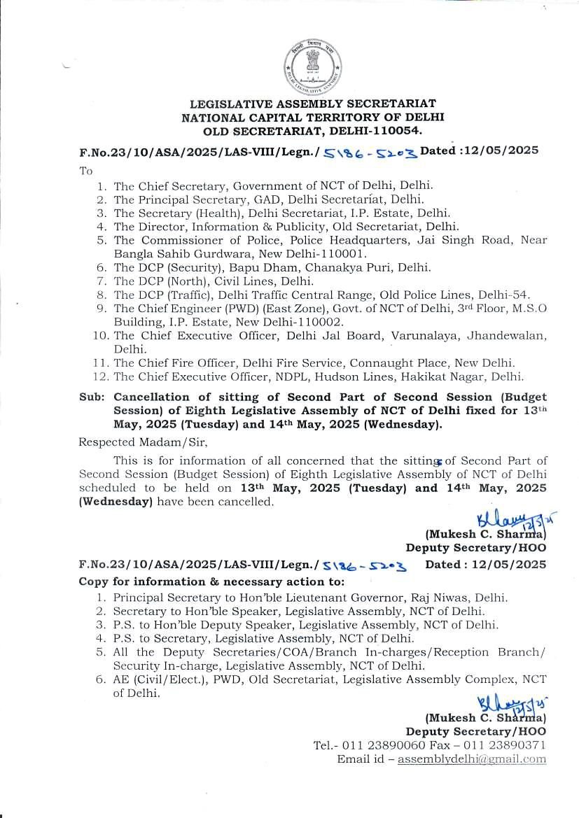 नई दिल्ली (12 मई 2025): राष्ट्रीय राजधानी क्षेत्र दिल्ली की आठवीं विधानसभा के दूसरे सत्र (बजट सत्र) के दूसरे भाग की 13 और 14 मई 2025 को प्रस्तावित बैठकें रद्द कर दी गई हैं। विधानसभा सचिवालय की ओर से जारी आधिकारिक सूचना में बताया गया है कि कुछ प्रशासनिक कारणों के चलते यह निर्णय लिया गया है। सत्र की अगली तिथियों की जानकारी जल्द ही अधिसूचना के माध्यम से जारी की जाएगी। यह निर्णय ऐसे समय में आया है जब राजधानी के कई अहम मसलों पर चर्चा की उम्मीद थी। विधानसभा सचिवालय ने सभी विधायकों और संबंधित विभागों को इस परिवर्तन की सूचना दे दी है।