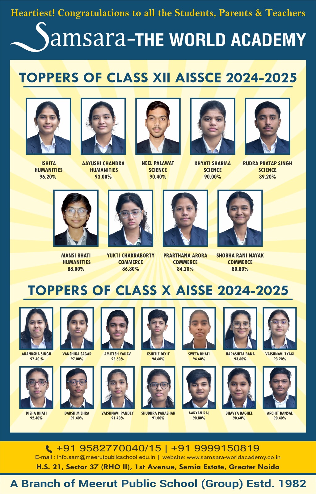 नोएडा (13 मई 2025): समसारा विद्यालय ने सीबीएसई बोर्ड परीक्षा 2024-25 के 10वीं और 12वीं कक्षा के परिणामों में शानदार प्रदर्शन कर एक बार फिर अपना परचम लहराया है। मंगलवार को जैसे ही परीक्षा परिणाम घोषित हुए, विद्यालय परिसर में खुशी की लहर दौड़ गई और छात्रों, अभिभावकों व शिक्षकों के चेहरों पर गर्व और संतोष की झलक देखने को मिली।