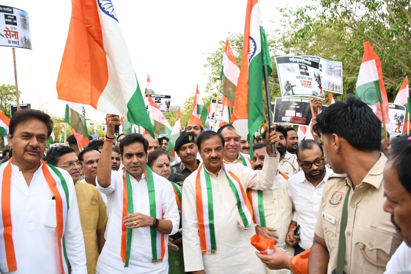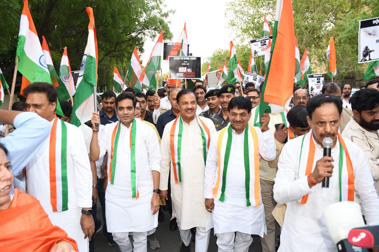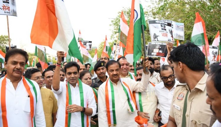 विधायक पंकज सिंह ने कहा कि अब आतंकवाद का जवाब निंदा से नहीं, सेना की कार्रवाई से दिया जाता है। जिलाध्यक्ष महेश चौहान ने भी देश की सुरक्षा में जनता की एकजुटता को बल दिया।
