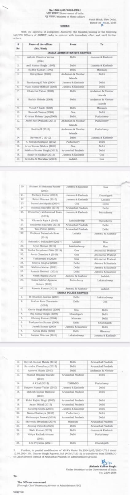 IAS अधिकारियों में 1994 बैच के वरिष्ठ अधिकारी आशीष चंद्र वर्मा को जम्मू-कश्मीर भेजा गया है। वहीं, 1995 बैच के अनिल कुमार सिंह का भी तबादला जम्मू-कश्मीर किया गया है। 1999 बैच के सुधीर कुमार को मिजोरम स्थानांतरित किया गया है। इन अधिकारियों ने दिल्ली सरकार के कई अहम विभागों में कार्य किया था और इनके अनुभव का इस्तेमाल अब दूसरे संवेदनशील क्षेत्रों में किया जाएगा। अन्य प्रमुख तबादलों में 2008 बैच की IAS चंचल यादव और सचिन शिंदे को अंडमान-निकोबार भेजा गया है। इसी बैच के विनोद पी कबले को मिजोरम भेजा गया है। 2009 बैच के कृष्ण मोहन उप्पू को पुडुचेरी, जबकि 2012 बैच के नवीन एस एल को भी जम्मू-कश्मीर स्थानांतरित किया गया है। वहीं हाल ही में सेवाएं शुरू करने वाली 2020 और 2021 बैच की अधिकारी श्रेया सिंगला, महिमा मदन और अनंत द्विवेदी को भी जम्मू-कश्मीर भेजा गया है।