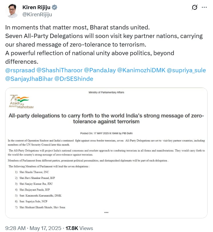भारत ने ‘ऑपरेशन सिंदूर’ को लेकर अंतरराष्ट्रीय मंचों पर अपना पक्ष मजबूती से रखने की तैयारी कर ली है। केंद्रीय मंत्री किरेन रिजिजू ने जानकारी दी है कि जल्द ही एक सात सदस्यीय सर्वदलीय सांसदों का प्रतिनिधिमंडल अमेरिका, ब्रिटेन, दक्षिण अफ्रीका और कतर जैसे प्रमुख साझेदार देशों का दौरा करेगा। यह प्रतिनिधिमंडल दुनिया को आतंकवाद के खिलाफ भारत की नीति और पाकिस्तान की भूमिका से अवगत कराएगा। रिजिजू ने ट्वीट कर कहा कि “महत्वपूर्ण क्षणों में भारत एकजुट है,” और यह दौरा राष्ट्रीय एकता का प्रतीक होगा। भारत का उद्देश्य है कि ऑपरेशन सिंदूर में सामने आए तथ्यों को वैश्विक समुदाय के सामने रखा जाए। इसके जरिये आतंकवाद पर जीरो टॉलरेंस नीति को अंतरराष्ट्रीय समर्थन दिलाना है।