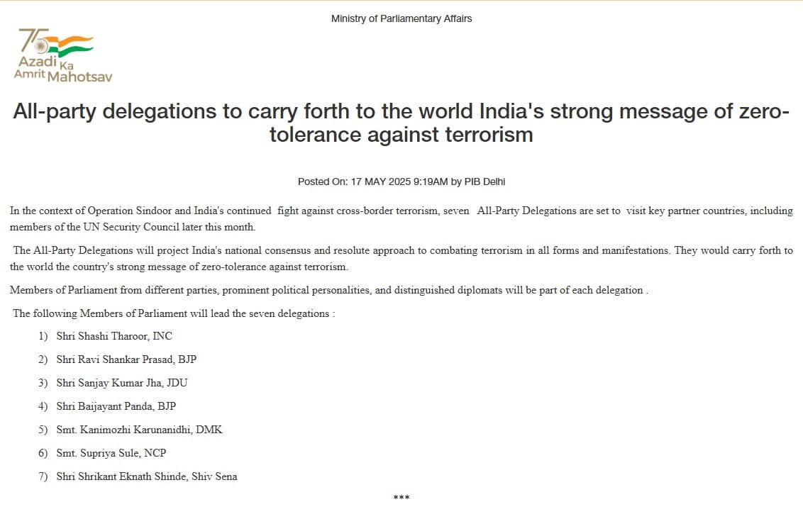 सर्वदलीय प्रतिनिधिमंडल में 7 प्रमुख सांसद शामिल
