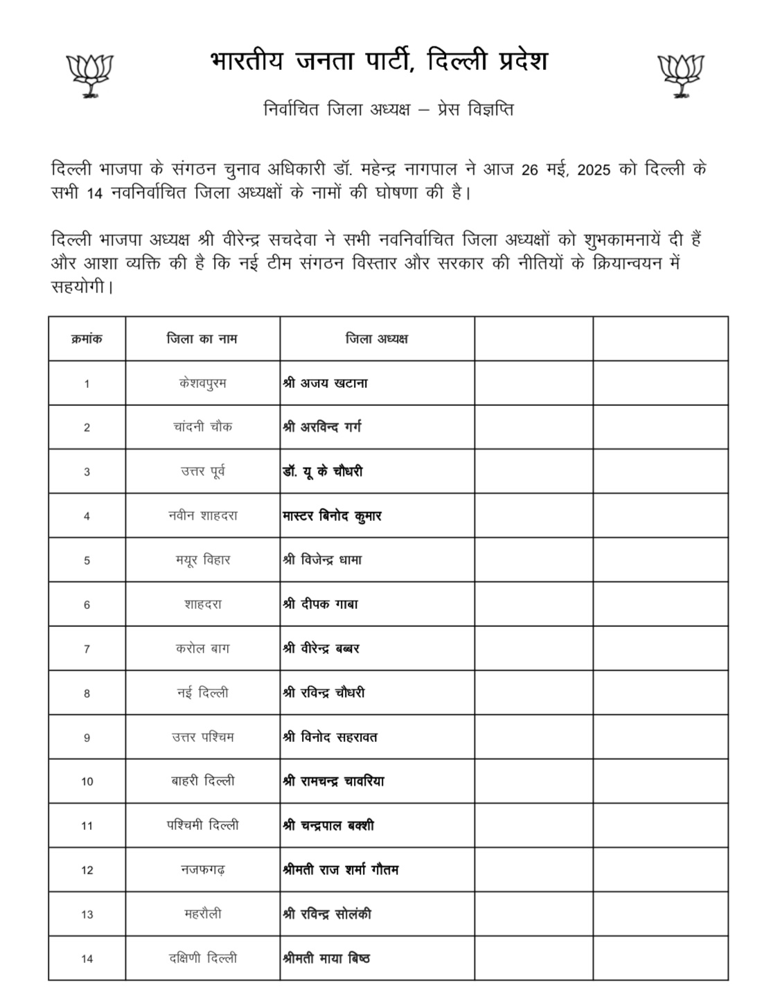 नई लिस्ट के अनुसार शाहदरा से दीपक गाबा, मयूर विहार से विजेंद्र धामा और चांदनी चौक से अरविंद गर्ग को जिला अध्यक्ष की जिम्मेदारी दी गई है। करोल बाग से बिरेंद्र बब्बर और महरौली से रविन्द्र सोलंकी को नए नेतृत्व के रूप में चुना गया है। वहीं नवीन शाहदरा में मास्टर विनोद को मौका मिला है, जबकि केशवपुरम से अजय खटाना और उत्तर पूर्वी जिले से यू.के. चौधरी को पद सौंपा गया है। उत्तर पश्चिम जिले की कमान अब विनोद सहरावत के हाथों में होगी। नई दिल्ली जिला अध्यक्ष के रूप में रविन्द्र चौधरी को जिम्मेदारी दी गई है।