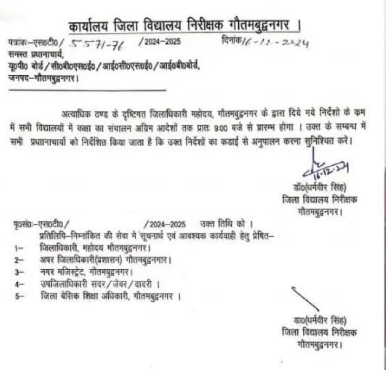 ग्रेटर नोएडा (16 दिसंबर 2024): गौतमबुद्धनगर में कड़ाके की ठंड के कारण छात्रों के स्वास्थ्य को ध्यान में रखते हुए जिलाधिकारी के निर्देश पर स्कूलों का समय बदल दिया गया है। अब जिले के सभी स्कूल सुबह 9 बजे से कक्षाएं शुरू करेंगे। यह निर्णय तत्काल प्रभाव से लागू कर दिया गया है।