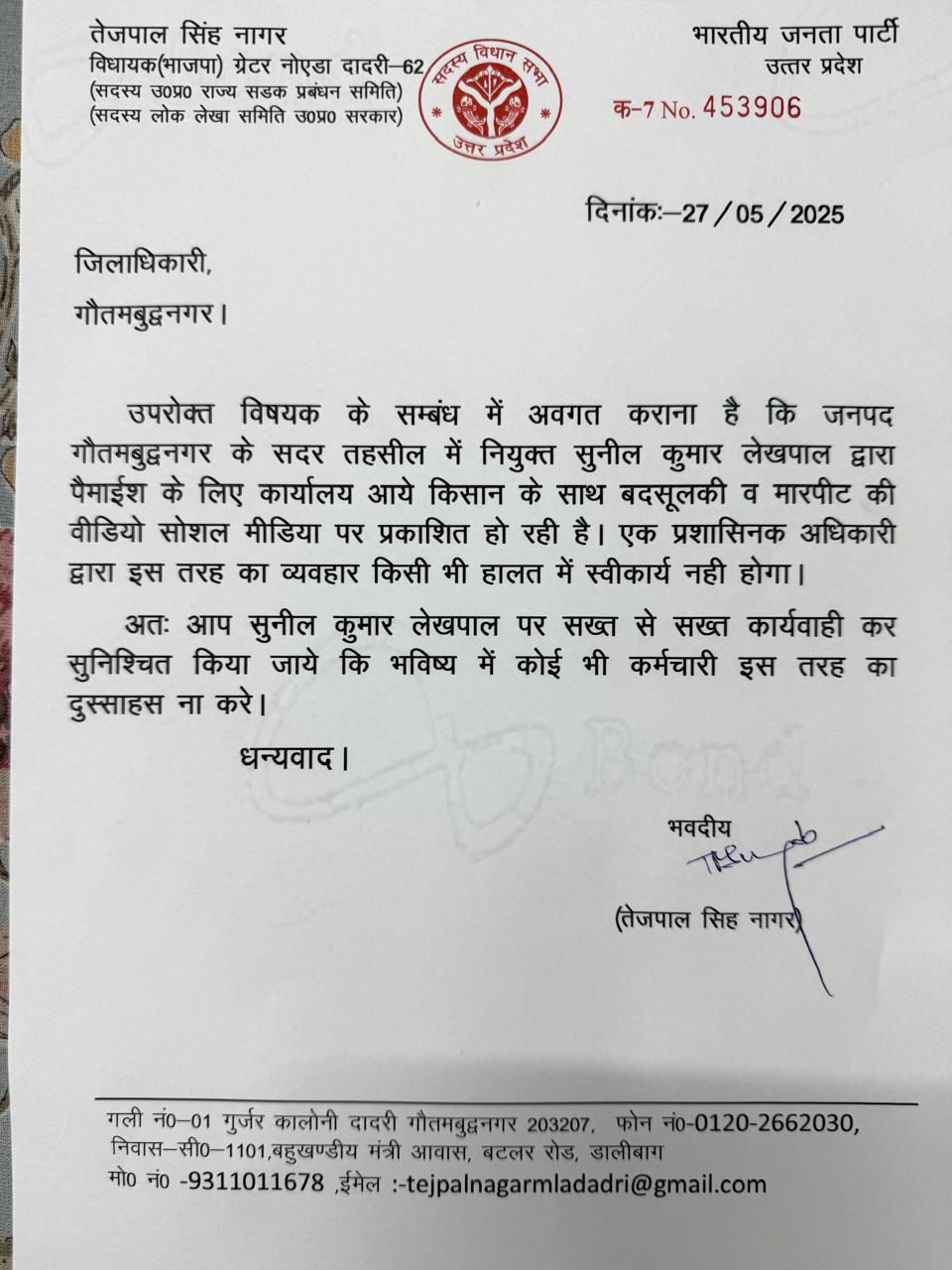 ग्रेटर नोएडा (28 मई 202): ग्रेटर नोएडा की सदर तहसील में पाली गांव के किसान के साथ हुई मारपीट के मामले में प्रशासन ने त्वरित संज्ञान लेते हुए कार्रवाई की है और मारपीट करने वाले लेखपाल को सभी जिम्मेदारियों से मुक्त करते हुए उसके खिलाफ कार्रवाई के आदेश जारी किए हैं।