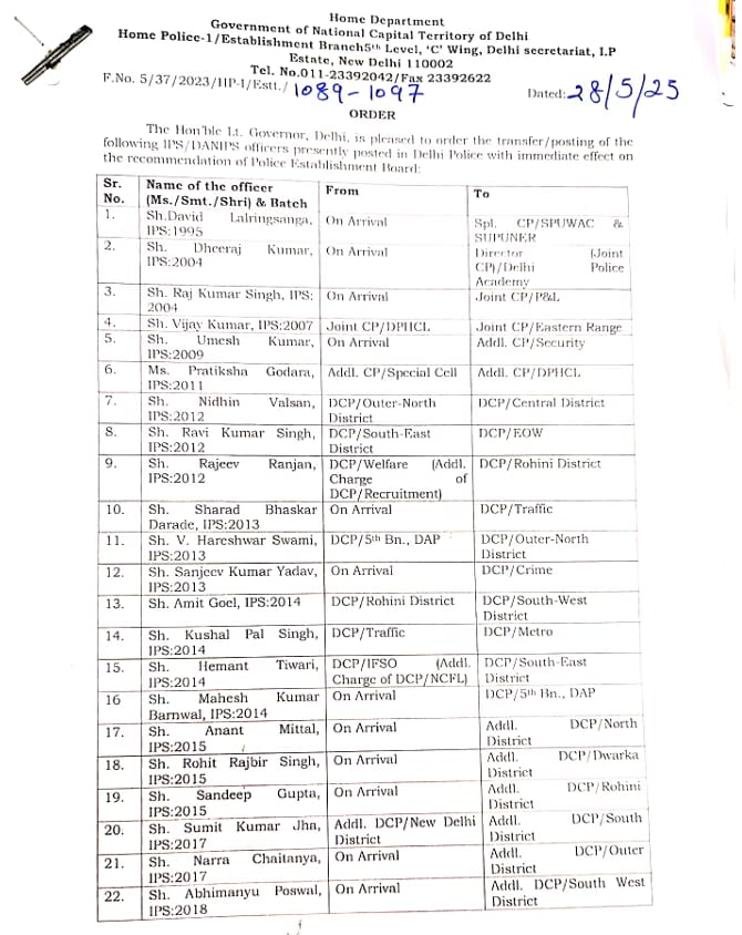 नई दिल्ली (28 मई 2025): राजधानी दिल्ली की कानून व्यवस्था को और अधिक चुस्त-दुरुस्त बनाने के उद्देश्य से दिल्ली पुलिस महकमे में एक बड़ा प्रशासनिक फेरबदल किया गया है। गृह विभाग द्वारा 28 मई 2025 को जारी आदेश के तहत 24 आईपीएस और 14 डैनिप्स (DANIPS) अधिकारियों का ट्रांसफर कर दिया गया है। इस फेरबदल में न सिर्फ कई जिलों के डीसीपी बदले गए हैं, बल्कि कुछ अधिकारियों को पहली बार फील्ड पोस्टिंग भी दी गई है। इस फेरबदल में वरिष्ठ आईपीएस अधिकारी अमित गोयल को डीसीपी रोहिणी से हटाकर दक्षिण-पश्चिम जिला भेजा गया है। वहीं हेमंत तिवारी को साइबर फॉरेंसिक लैब IFSO से हटाकर दक्षिण-पूर्व जिले की कमान सौंपी गई है। रवि कुमार सिंह को दक्षिण-पूर्व से डीसीपी ईओडब्ल्यू (आर्थिक अपराध शाखा) भेजा गया है। राजीव रंजन को डीसीपी वेलफेयर से डीसीपी रोहिणी बनाया गया है, जिससे साफ संकेत है कि क्राइम कंट्रोल और लोक व्यवस्था पर विशेष ध्यान दिया जा रहा है।
