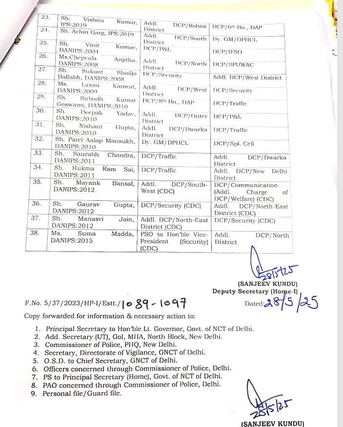 दिल्ली पुलिस में बड़ा प्रशासनिक फेरबदल: 38 अधिकारियों का तबादला, कई जिलों के DCP बदले