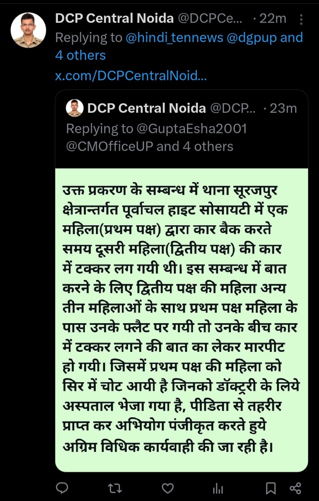 डीसीपी सेंट्रल नोएडा शक्ति मोहन अवस्थी ने बताया कि “उक्त प्रकरण के सम्बन्ध में थाना सूरजपुर क्षेत्रान्तर्गत पूर्वांचल हाइट सोसायटी में एक महिला (प्रथम पक्ष) द्वारा कार बैक करते समय दूसरी महिला (द्वितीय पक्ष) की कार में टक्कर लग गयी थी। इस सम्बन्ध में बात करने के लिए द्वितीय पक्ष की महिला अन्य तीन महिलाओं के साथ प्रथम पक्ष महिला के पास उनके फ्लैट पर गयी तो उनके बीच कार में टक्कर लगने की बात को लेकर मारपीट हो गयी। जिसमें प्रथम पक्ष की महिला को सिर में चोट आयी है जिनको डॉक्टरी के लिये अस्पताल भेजा गया है, पीड़िता से तहरीर प्राप्त कर अभियोग पंजीकृत करते हुए अग्रिम विधिक कार्यवाही की जा रही है।।