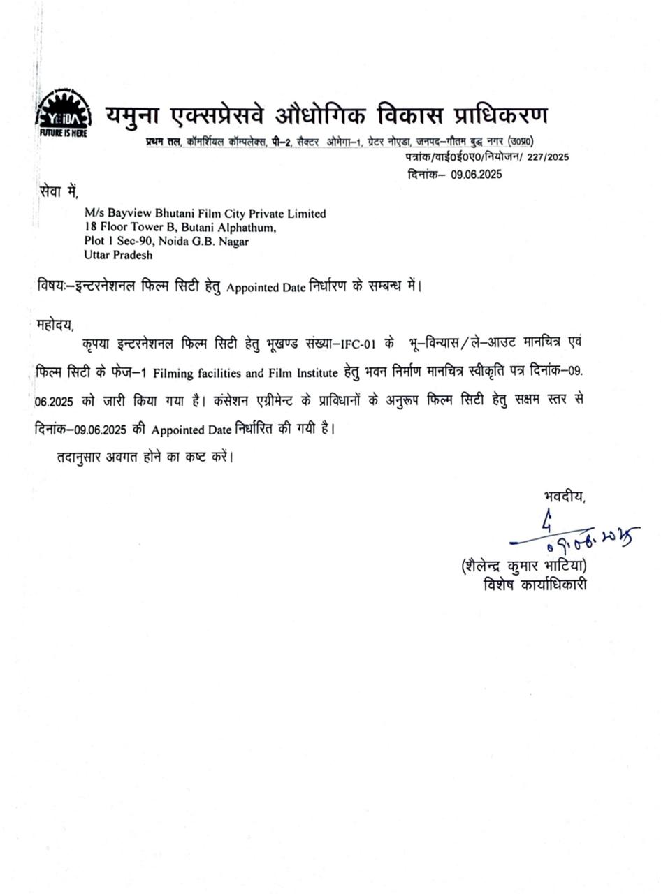सोमवार शाम को फिल्म निर्माता बोनी कपूर को यीडा द्वारा स्वीकृत लेआउट प्लान सौंपा गया। इस अवसर पर भूटानी इंफ्रा के सीईओ आशीष भूटानी भी मौजूद रहे। बताया गया कि पहले चरण के तहत कंपनी को फिल्म सिटी और फिल्म इंस्टीट्यूट से जुड़ी गतिविधियों का कम से कम 15 प्रतिशत कार्य पूर्ण करना अनिवार्य होगा। इसके बाद ही प्राधिकरण द्वारा कंपनी को व्यावसायिक निर्माण की अनुमति दी जाएगी।