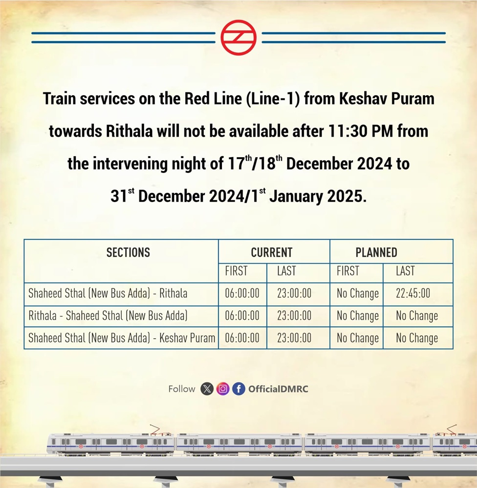 नई दिल्ली (19 दिसंबर 2024): दिल्ली मेट्रो की येलो लाइन पर 21 से 28 दिसंबर तक टाइमिंग बदली गई। दिल्ली मेट्रो रेल निगम (DMRC) ने येलो लाइन पर मेट्रो सेवाओं के समय में बदलाव की घोषणा की है। यह परिवर्तन मेट्रो फेज-4 के कॉरिडोर निर्माण कार्य के कारण किया गया है।