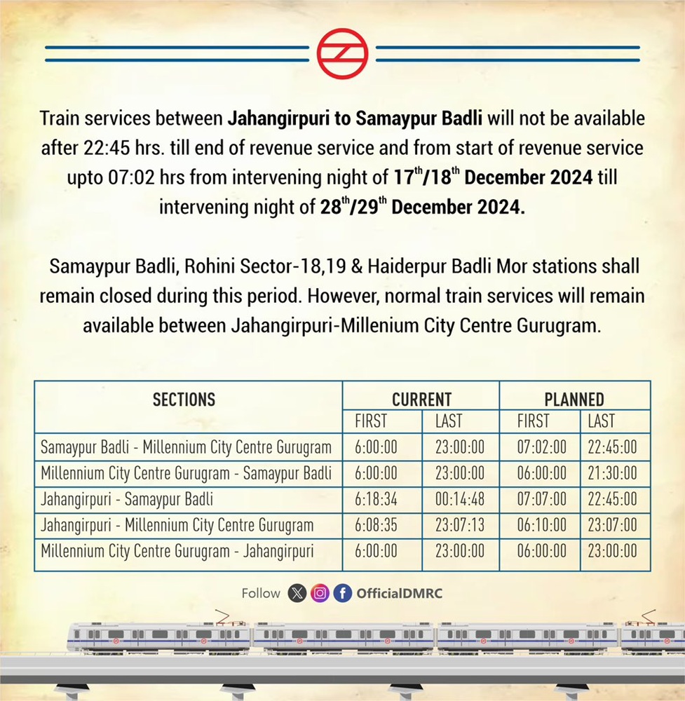 समयपुर बादली से मिलेनियम सिटी सेंटर गुरुग्राम के बीच चलने वाली मेट्रो सुबह एक घंटे की देरी से उपलब्ध होगी। पहली मेट्रो सुबह 7:02 बजे चलेगी।