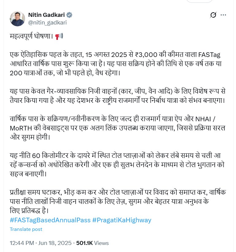 नई दिल्ली (18 जून 2025): केंद्रीय सड़क परिवहन और राजमार्ग मंत्री नितिन गडकरी ने आज देश के करोड़ों निजी वाहन चालकों को राहत की सौगात दी है। उन्होंने एक नई योजना की घोषणा करते हुए बताया कि 15 अगस्त 2025 से सरकार ₹3,000 में FASTag आधारित वार्षिक पास शुरू करने जा रही है। यह पास निजी कार, जीप और वैन जैसे गैर-व्यावसायिक वाहनों पर लागू होगा, और इसे एक वर्ष तक या 200 यात्राओं तक उपयोग में लाया जा सकेगा – जो भी पहले पूरा हो।