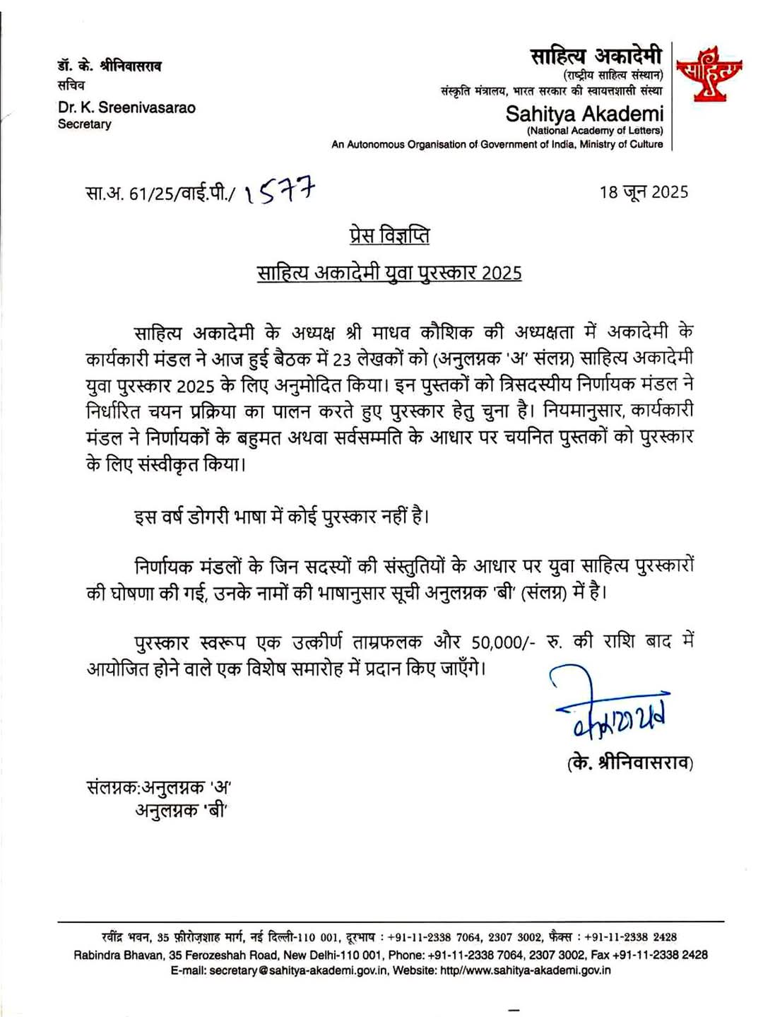 23. तेलुगु भाषा में गंगिसेट्टी शिवकुमार की कहानी “काकुलुरु देवता” को सम्मान मिला।
