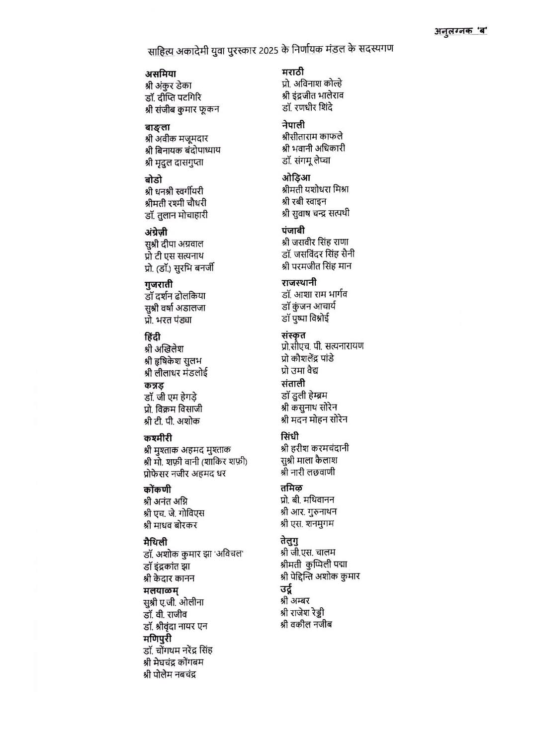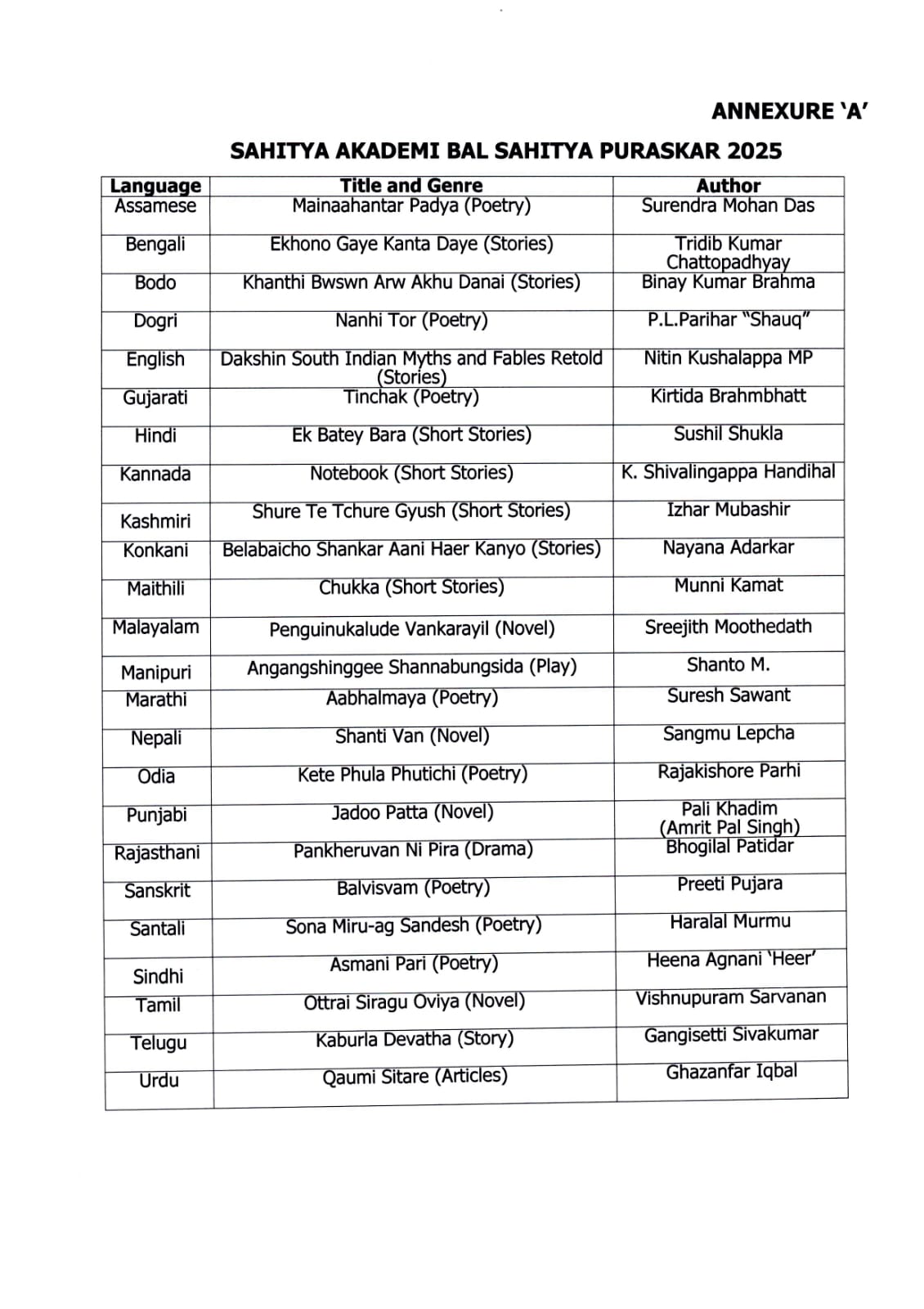 13. मणिपुरी भाषा में शांतों एस. का नाटक “अंगांगशिंगगी शत्रुबुंगशिदा” पुरस्कृत हुआ।