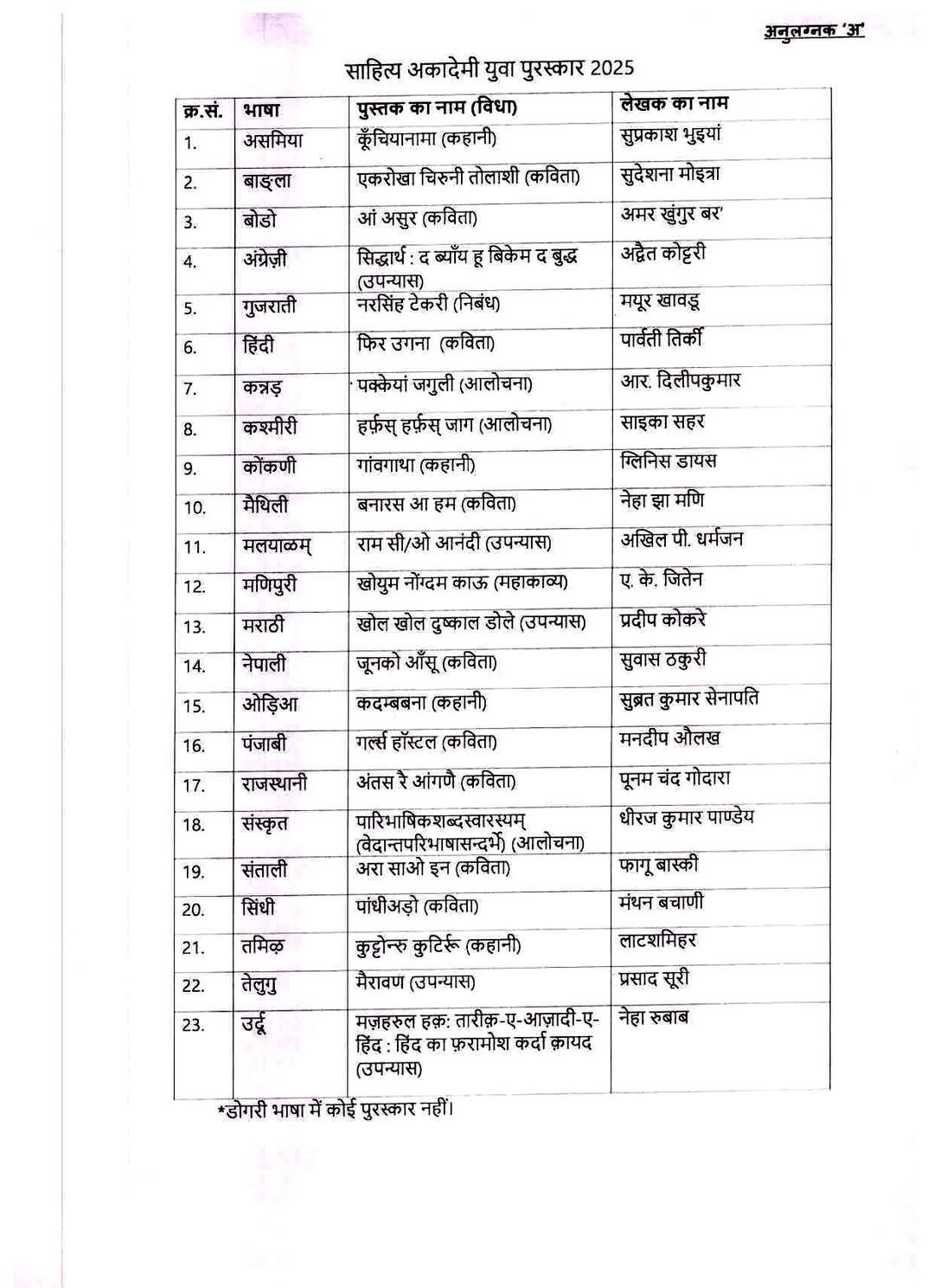 4. डोगरी भाषा में पी.एल.परिहार ‘शक्र’ की कविता “नहीं टोर” को पुरस्कृत किया गया।