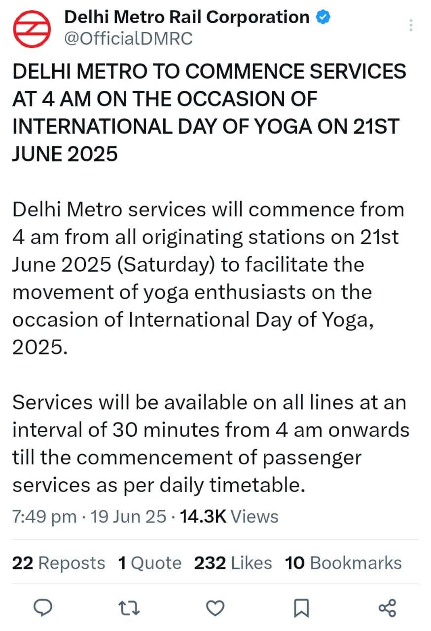 DMRC ने यह फैसला राजधानी सहित देशभर में बड़े पैमाने पर मनाए जाने वाले योग कार्यक्रमों को ध्यान में रखते हुए लिया है, जिससे हजारों की संख्या में योग साधक समय से कार्यक्रम स्थलों तक पहुंच सकें।