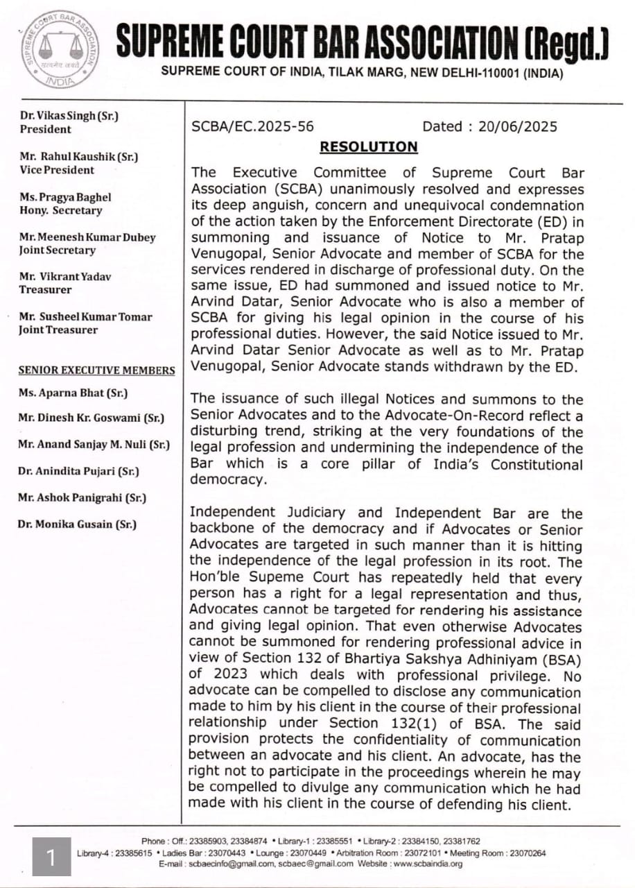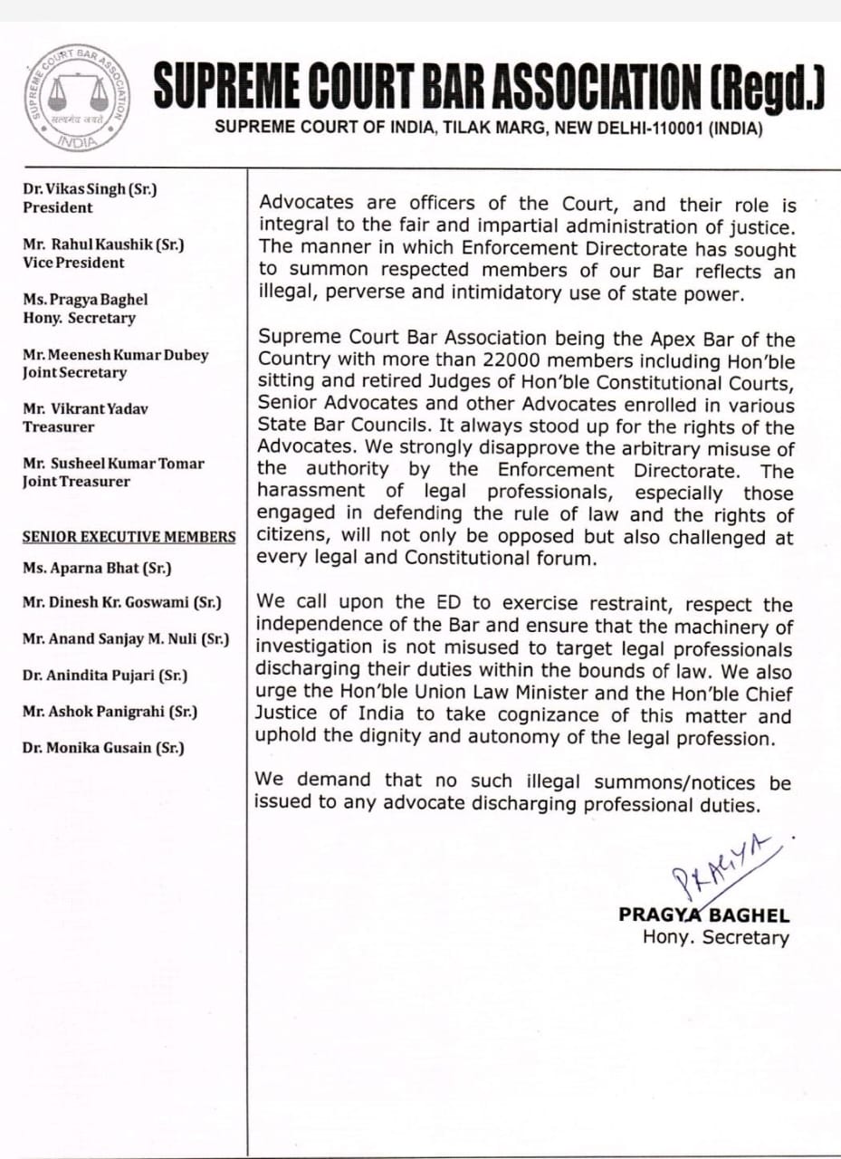 सुप्रीम कोर्ट बार एसोसिएशन (SCBA) की कार्यकारी समिति ने प्रवर्तन निदेशालय (ED) द्वारा वरिष्ठ अधिवक्ताओं प्रताप वेंगूपल और अरविंद दातार को पेशेवर कर्तव्यों के निर्वहन के लिए समन जारी किए जाने पर गहरी पीड़ा, चिंता और स्पष्ट निंदा व्यक्त की है।