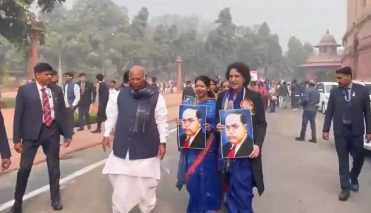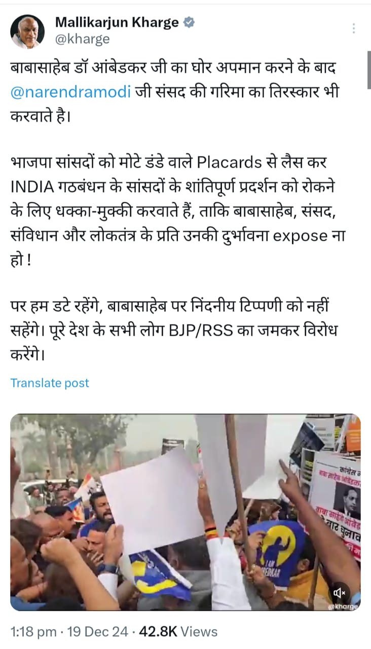 खड़गे ने इस घटना को “लोकतंत्र और संविधान का अपमान” करार दिया और केंद्र सरकार पर निशाना साधते हुए कहा कि भाजपा सांसदों ने जानबूझकर INDIA गठबंधन के प्रदर्शन को रोकने की कोशिश की। उन्होंने X (पूर्व में ट्विटर) पर लिखा, “बाबासाहेब डॉ. आंबेडकर का अपमान करने के बाद अब भाजपा संसद की गरिमा का तिरस्कार कर रही है। भाजपा सांसद मोटे डंडे वाले प्लेकार्ड लेकर हमारे शांतिपूर्ण प्रदर्शन को बाधित कर रहे हैं।”