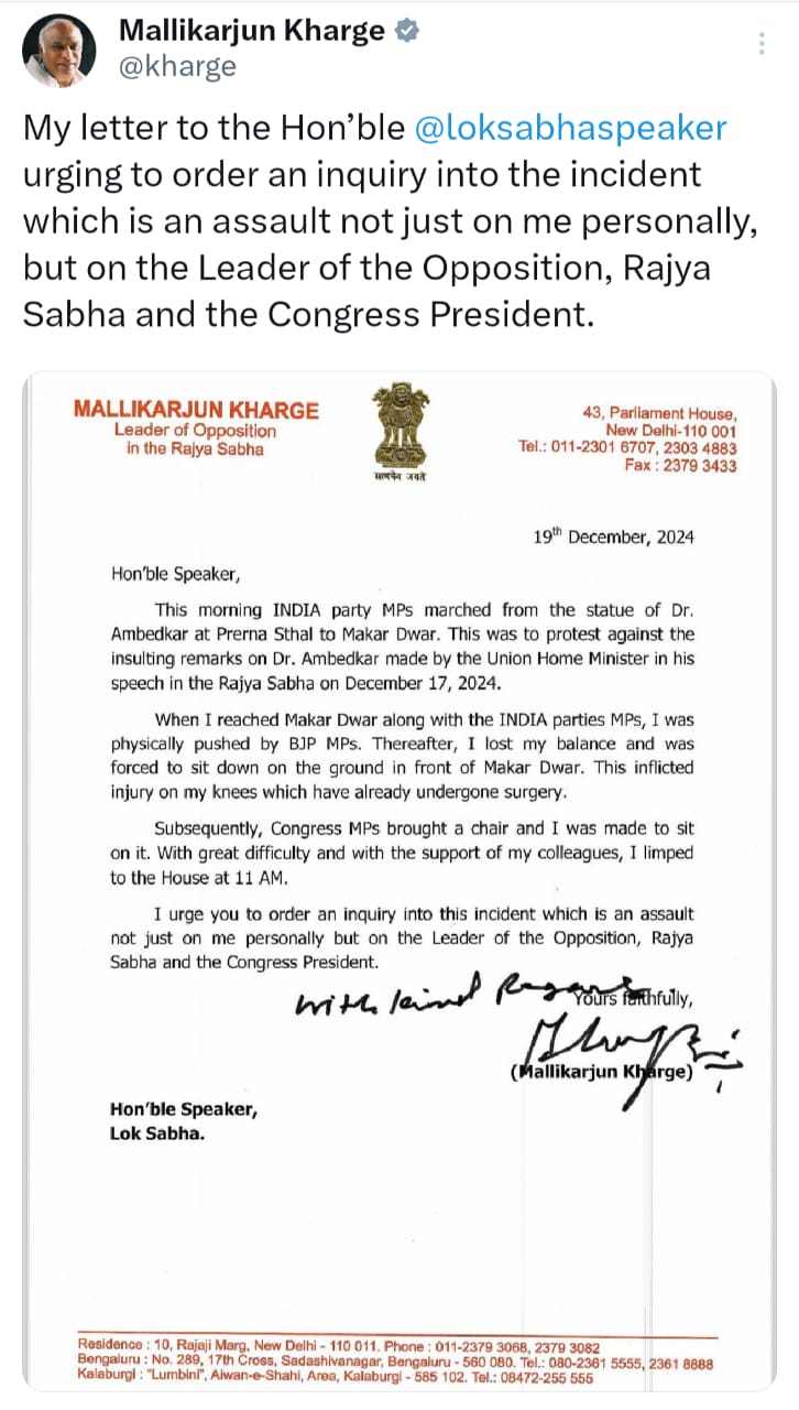 मल्लिकार्जुन खड़गे ने अपने पत्र में लिखा कि जब वह इंडिया गठबंधन के अन्य सांसदों के साथ प्रेरणा स्थल से मकर द्वार की ओर शांतिपूर्ण मार्च कर रहे थे, तब भाजपा सांसदों ने उन्हें धक्का दिया, जिससे वह गिर पड़े और उनके घुटनों में चोट लग गई। खड़गे ने कहा कि उनके घुटनों में पहले भी सर्जरी हो चुकी है, जिससे यह चोट और गंभीर हो गई है। घटना के बाद कांग्रेस सांसदों ने कुर्सी लाकर उनकी मदद की और उन्हें सहारा देकर सदन तक पहुंचाया।