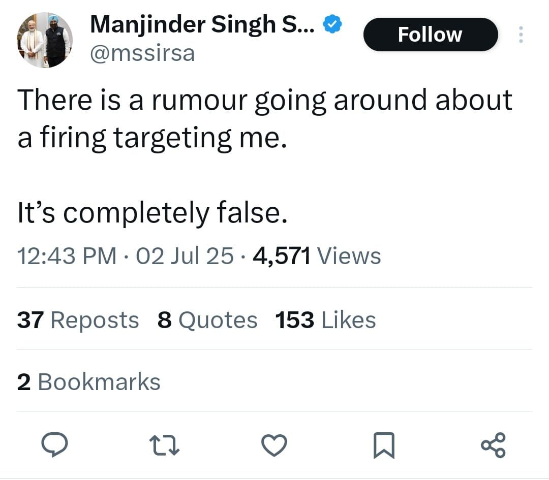दिल्ली सरकार के मंत्री मनजिंदर सिंह सिरसा ने भी खुद पर फायरिंग की अफवाहों का खंडन किया है। सोशल मीडिया प्लेटफार्म एक्स पर पोस्ट करते हुए कहा, “There is a rumour going around about a firing targeting me.