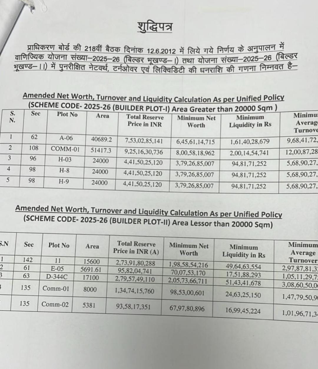 NOIDA News (08/07/2025): नोएडा प्राधिकरण (NOIDA Authority) ने अपनी 218वीं बोर्ड बैठक (दिनांक 12 जून 2025) में लिए गए निर्णय के आधार पर बिल्डर भूखण्ड योजनाएं संख्या 2025-26 (फेज-I एवं II) के लिए पुनरीक्षित नेटवर्क, टर्नओवर एवं लिक्विडिटी के आधार पर भुगतान की दूसरी किस्त से जुड़ी सार्वजनिक सूचना जारी की है।