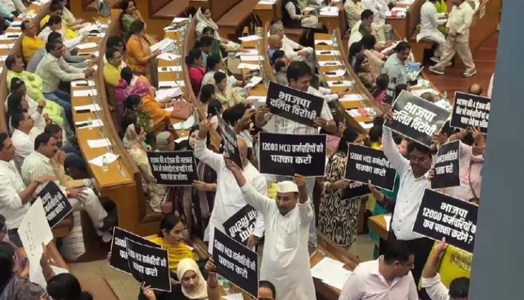New Delhi News (10/07/2025): दिल्ली नगर निगम (MCD) सदन की बैठक आज उस समय विवादों में घिर गई जब आम आदमी पार्टी के पार्षदों ने 12 हज़ार अस्थायी कर्मचारियों को स्थायी करने की मांग उठाई।